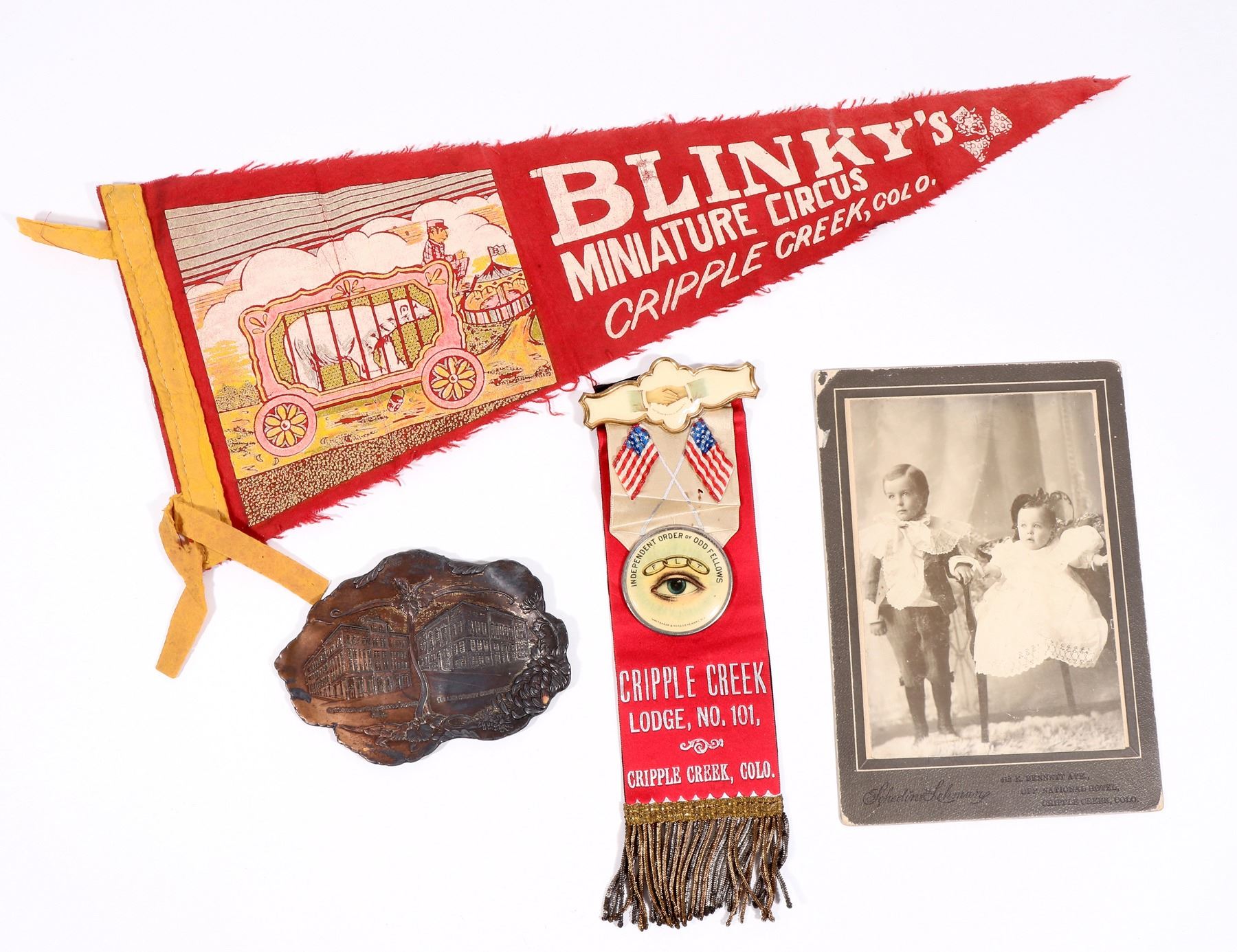 IOOF Cripple Creek red ribbon, 9". Children photo by Lehman, 5.25x4.25". Blinky's Miniature Circus pennant, 17x7". Copper souvenir, 3.25x4.25". Colorado Cripple Creek