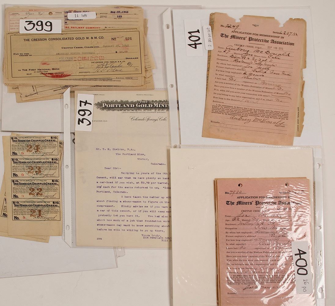 Group of checks and documents related to mining at Cripple Creek, c 1895-1930. The best are perhaps the Miners Protective Association membership applications. This was a union for miners., c1915. They came into play after the WFM became so entrenched in virtual warfare with mine owners. about 50 pcs overall. Date: Location: Cripple Creek, Colorado HWAC# 56019