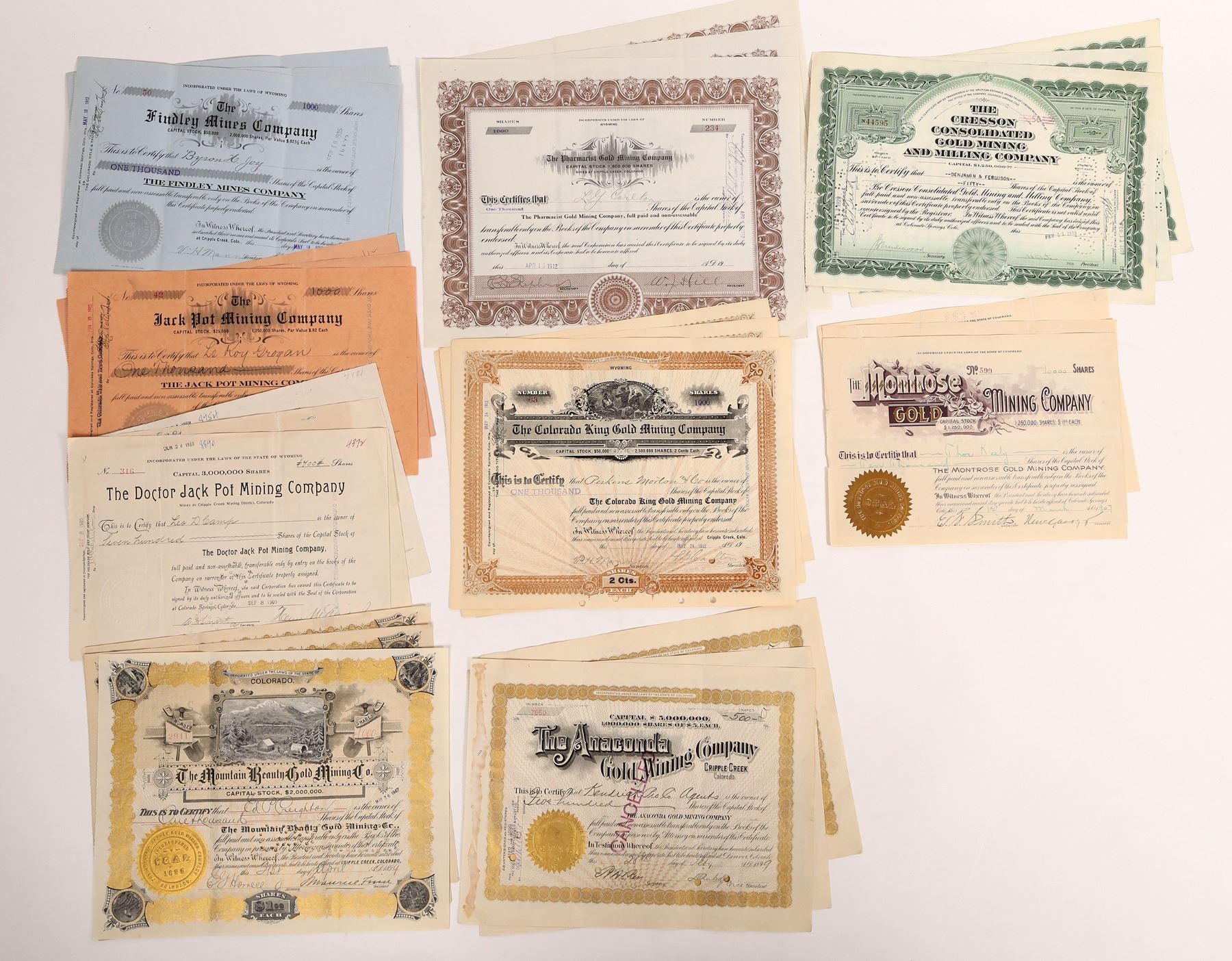 Cripple Creek mining stocks in groups of 3 each-Anaconda, Mountain Beauty, Giesson, Colorado King, Pharmacist, Doctor Jackpot, Findley. Cripple Creek Colorado