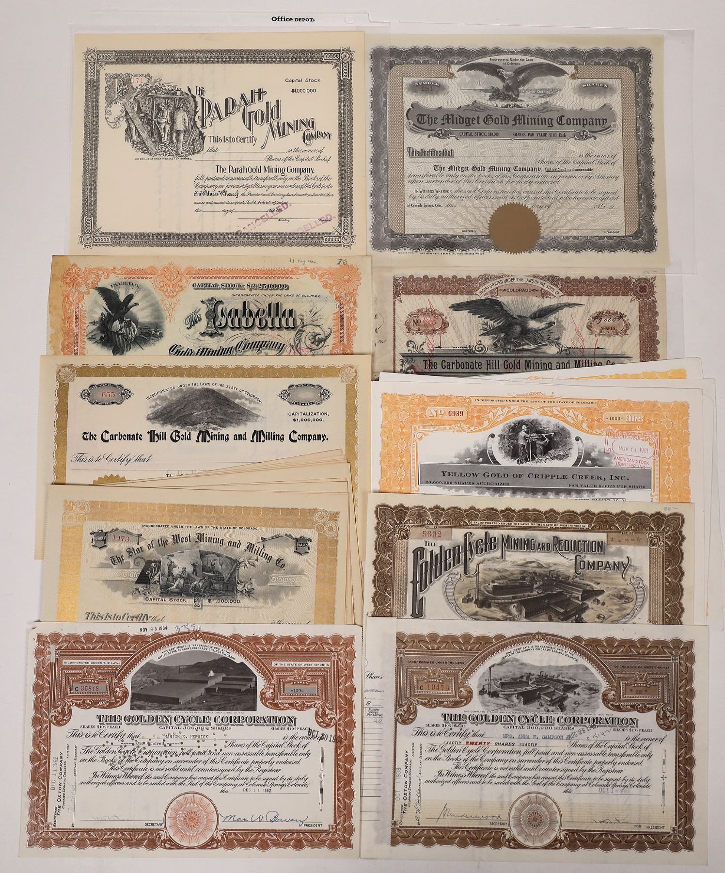 Lot of 33. Mix of issued and unissued. Included: Isabella Gold Mining Company (1895, signed by JJ Hagerman as president); Carbonate Hill Gold Mining & Milling Co. (1899 plus different unissued); Golden Cycle Mining & Reduction Company (3 different, 1917-1962, mill plant vignettes); Midget Gold Mining Co. (uniss.); Parah Gold MC (uniss.); Yellow Gold of Cripple Creek, Inc. (5 stocks, 1980-81); and Star of the West Mining & Milling Co. (20 unissued stocks, 1890s).