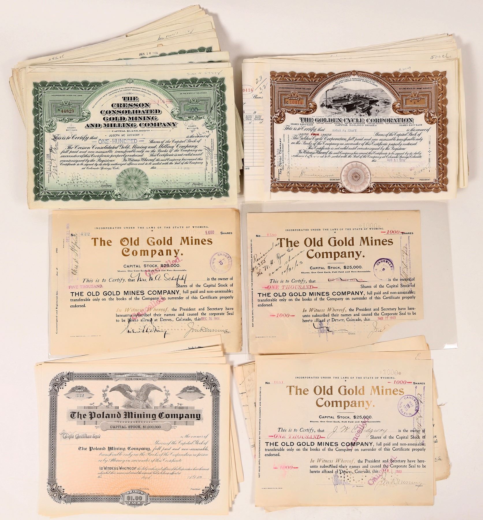 Lot of 150. 1) The Old Gold Mines Company. 5 stocks issued 1901-1903. 2) Poland Mining Company. 10 unissued stocks, c.1890s. 3) Golden Cycle Corporation. 35 issued stocks, 1930s. Brown border, black print, and vignette of cyanide plant. 4) Cresson Consolidated Gold Mining & Milling Company. 100 issued stocks, 1920s. Green border, black print, no vignette. Punch cancelled.