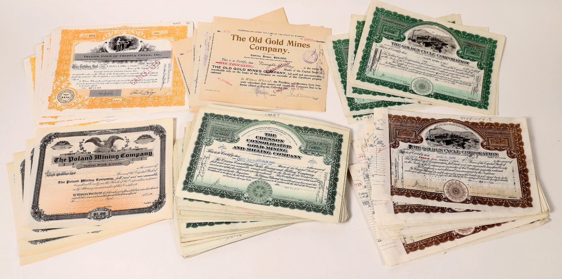Lot of 150. 1) Golden Cycle Corporation. 5 green border, 25 brown border. All with vignette of cyanide plant at Colorado Springs. 1930s-40s. 2) Yellow Gold of Cripple Creek, Inc. 5 stocks issued 1978-1980. Mine drilling vignette. 3) Poland Mining Company. 10 unissued stocks, c.1890s. 4) The Old Gold Mines Company. 5 stocks, issued 1901-03. 5) Cresson Consolidated Gold Mining and Milling Company. 100 stocks issued in the 1920s. Green border, black print, no vignette.