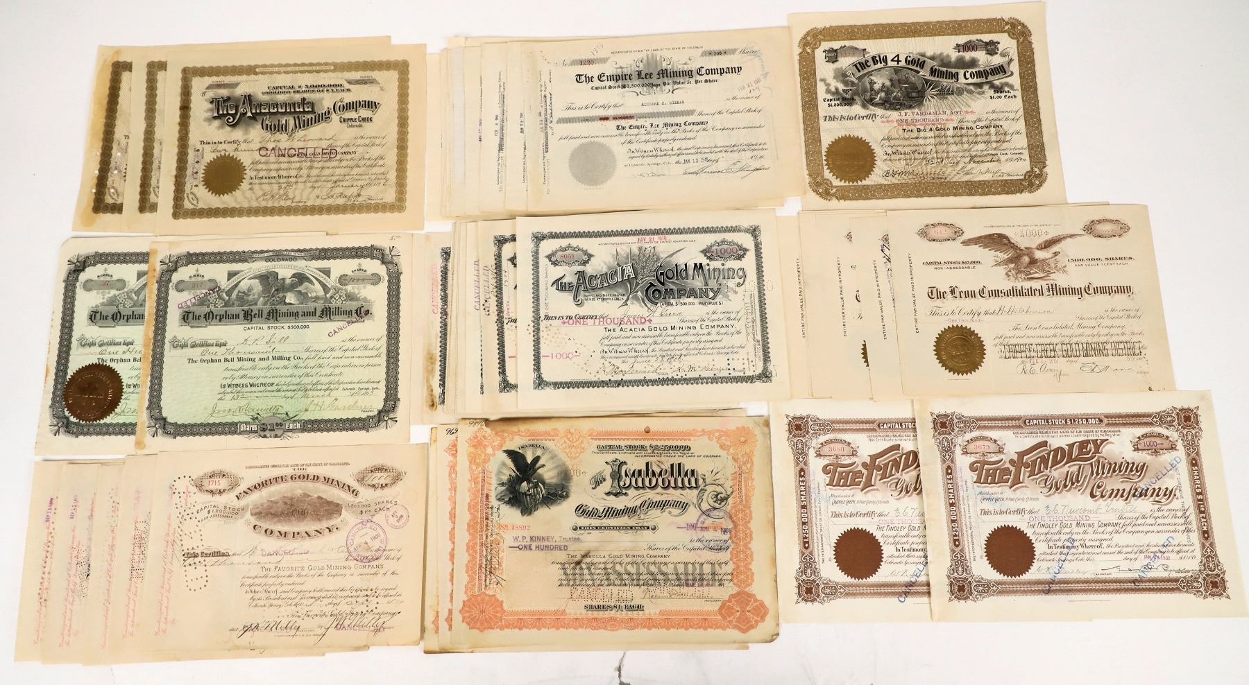 Cripple Creek Mining Stock Dealer Group includes Anaconda Gold MC, Orphan Gold MC, Orphan Bell Gold MC, Acacia Gold MC, Findley Gold MC, Big 4 Gold MC, Gould Cons. MC, Leon Cons. MC, Empire Lee MC, Isabella Gold MC, Favorite Gold MC, Volcano Gold MC, Golden Cycle Mining and Reduction Co, Golden Cycle Corp. c1890-1945 . About 60 pieces, mostly from gold mining companies, issued and cancelled, some with revenue stamps, embossed seals, etc. Excellent collection. See photo for condition and additional details.
