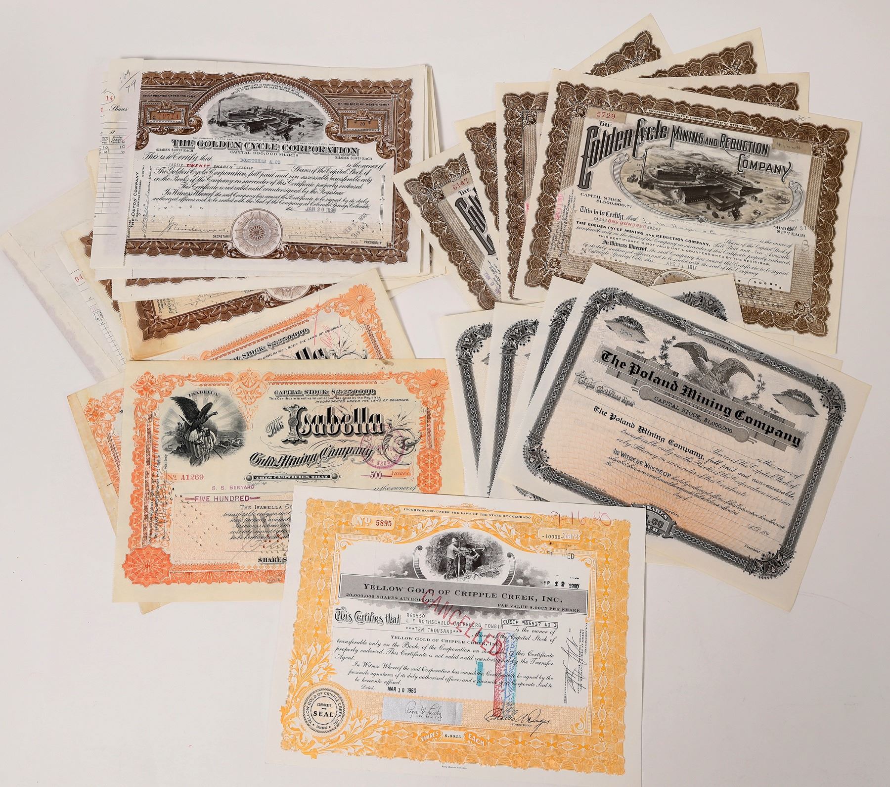 Lot of 30, numerous mines. 1) Two key autographs: Isabella GMC signed by Percy Hagerman, son of JJ Hagerman, and a well-known Colorado artist and namesake of Hagerman Pass; and Golden Cycle Mining & Reduction Co. signed by Cripple Creek millionaire AE Carlton. 2) Others: Isabella GMC (1902); Golden Cycle M&R Co. (3 stocks, 1917); Poland MC (4 unissued, 1890s); Golden Cycle Corp. (18 stocks, 1930s); and Yellow Gold of Cripple Creek, Inc. (1980, mine drilling vignette).