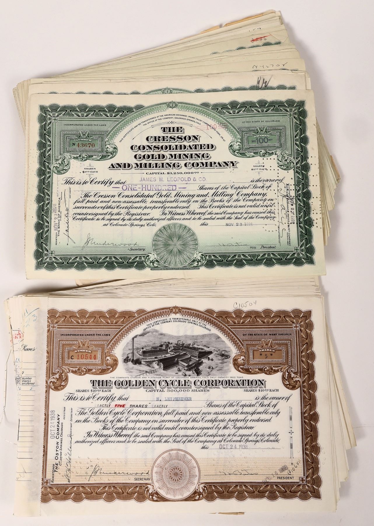 Lot of 150 issued stocks. 1) Golden Cycle Corporation. 50 stocks issued in the 1930s. Brown border, black print, and vignette of the company's cyanide and flotation plant at Colorado Springs. Punch cancelled. This company dates back to 1895, when DH Moffat was associated. At that point, they owned the La Bella, Legal Tender, Harrison claims on Bull Hill. 2) Cresson Consolidated Gold Mining & Milling Company. 100 stocks issued in the 1920s. Green border, black print, no vignette. Punch cancelled.
