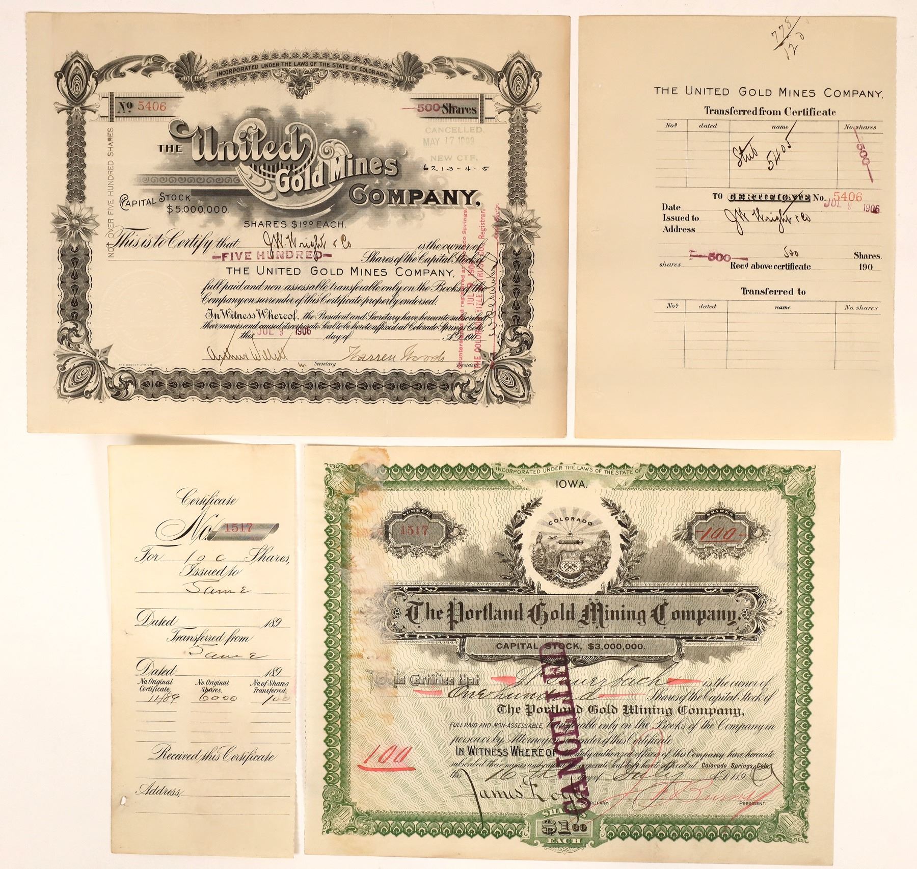 Lot of 2 different. 1) Portland Gold Mining Company. Inc. in Iowa. No. 1517, issued for 100 shares to W. Sauerbach on July 16th, 1897(?). Signed by JF Burns as president and James Doyle as secretary. Stamp cancelled. Green border, black print, and vignette of Colorado state seal. Glue residue on left border. James ("Jimmy") F. Burns became a millionaire after striking it rich in this company, the Portland Mine! 2) United Gold Mines Company. Inc. in Colorado. No. 5406, issued for 500 shares to JW Wright & Co. in 1906. Signed by Warren Woods as president and Arthur Willitt as secretary. Not cancelled. Black border and print with ornate logo. Pinholes, folds. Warren Woods and his sons, Frank and Harry, formed the Woods Investment Company and purchased a 136-acre site at the foot of Battle Mountain, where they platted a townsite and named it Victor, after an early homesteader named Victor C. Adams.
