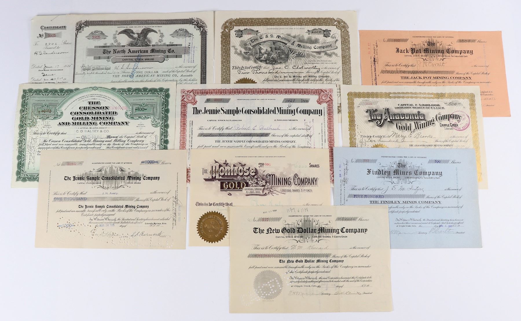 10 Cripple Creek Mining stocks. Jackpot, Anaconda, Jennie Sample-2 different, Montrose, Findley, New Gold Dollar, Cresson, C & S, North American. Cripple Creek Colorado