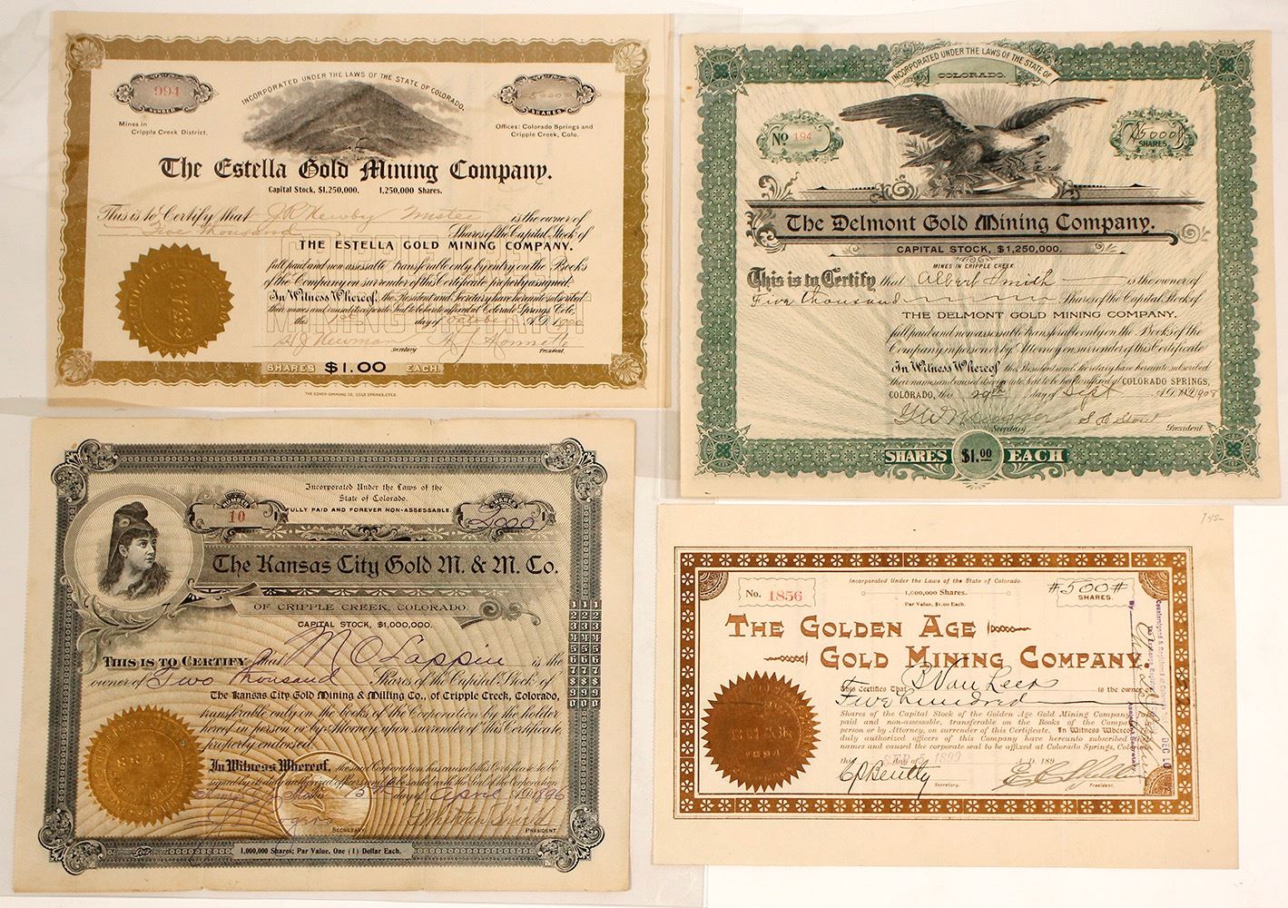 1) Delmont Gold Mining-owns the Little Maud and Buffalo on the south slope of Galena Hill, issued to Albert Smith 1908, #194 5000 shares, signed by president Stout, incorporated in CO ) Kansas City gold M. & M. issued to M Lappire 1896, #10 2000 shares, signed by president Shield -small chips on fold edges 3) Estella Gold Mining-16 acres on Copper Mt., issued to JR Newby 1900, #994 5000 shares, signed by president Momette Golden Age Mining-9 acres on Ironclad Hill, issued to B. Van leer 1899, #1856 500 shares, signed by vice president Shelden 4) Delmont Gold Mining-owns the Buffalo ans Little Maud on Galena Hill, issued to Albert Smith 1908, #194 5000 shares, signed by president Stout (Al Adams Gold Rush Memorabilia Collection) Date: Location: Cripple Creek, Colorado HWAC# 58740