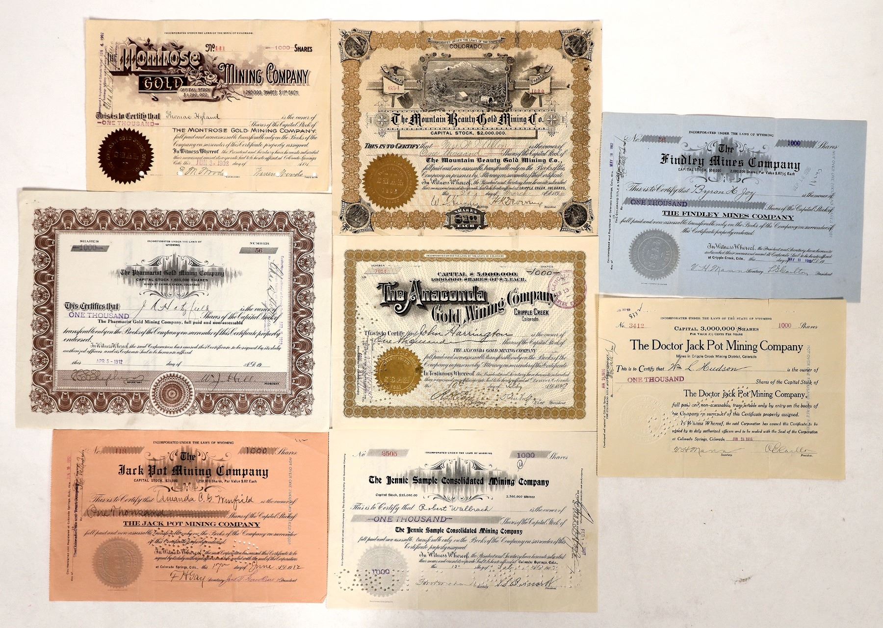 A collection of eight mining stocks from Colorado's famous Cripple Creek gold mining region, dating from 1896 to 1916. The group contains stocks from eight different gold mining companies active in the area; Jennie Sample Consolidated, Pharmacist, Doctor Jack Pot, Jackpot, Anaconda, Montrose, Mountain Beauty, and Findley. All bear the official seals of their respective companies, as well as the signatures of secretary and president. Several have been cancelled using a hole punch cancellation.