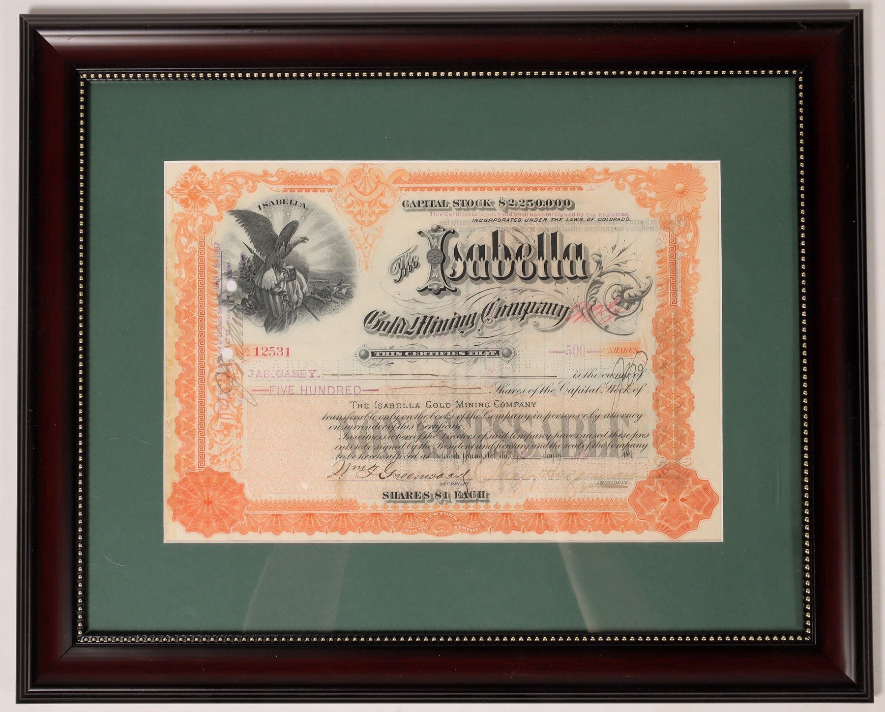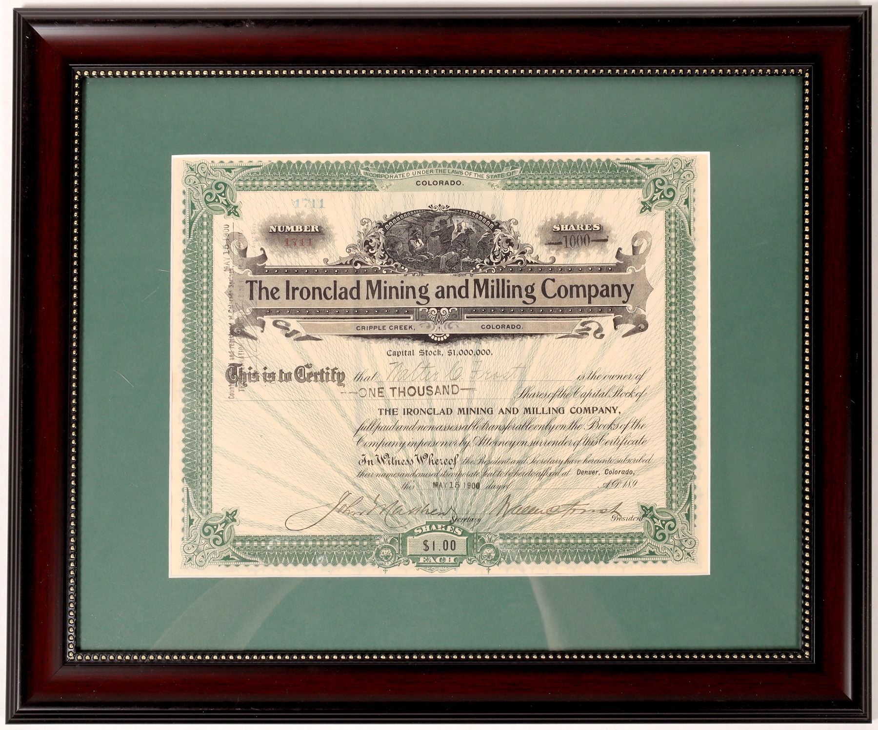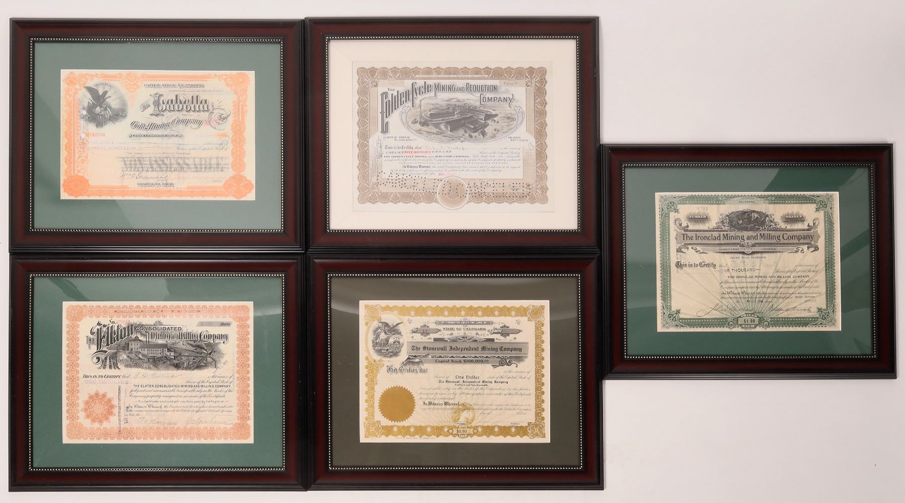 5 different Cripple Creek mining stocks in nice frames. Isabella Gold Mining 1897. Golden Cycle Mining 1915. Elkton Cons. Mining 1905. Stonewall Independent Mining 1900's. Ironclad Mining 1900. Frames 12.5x15.5"