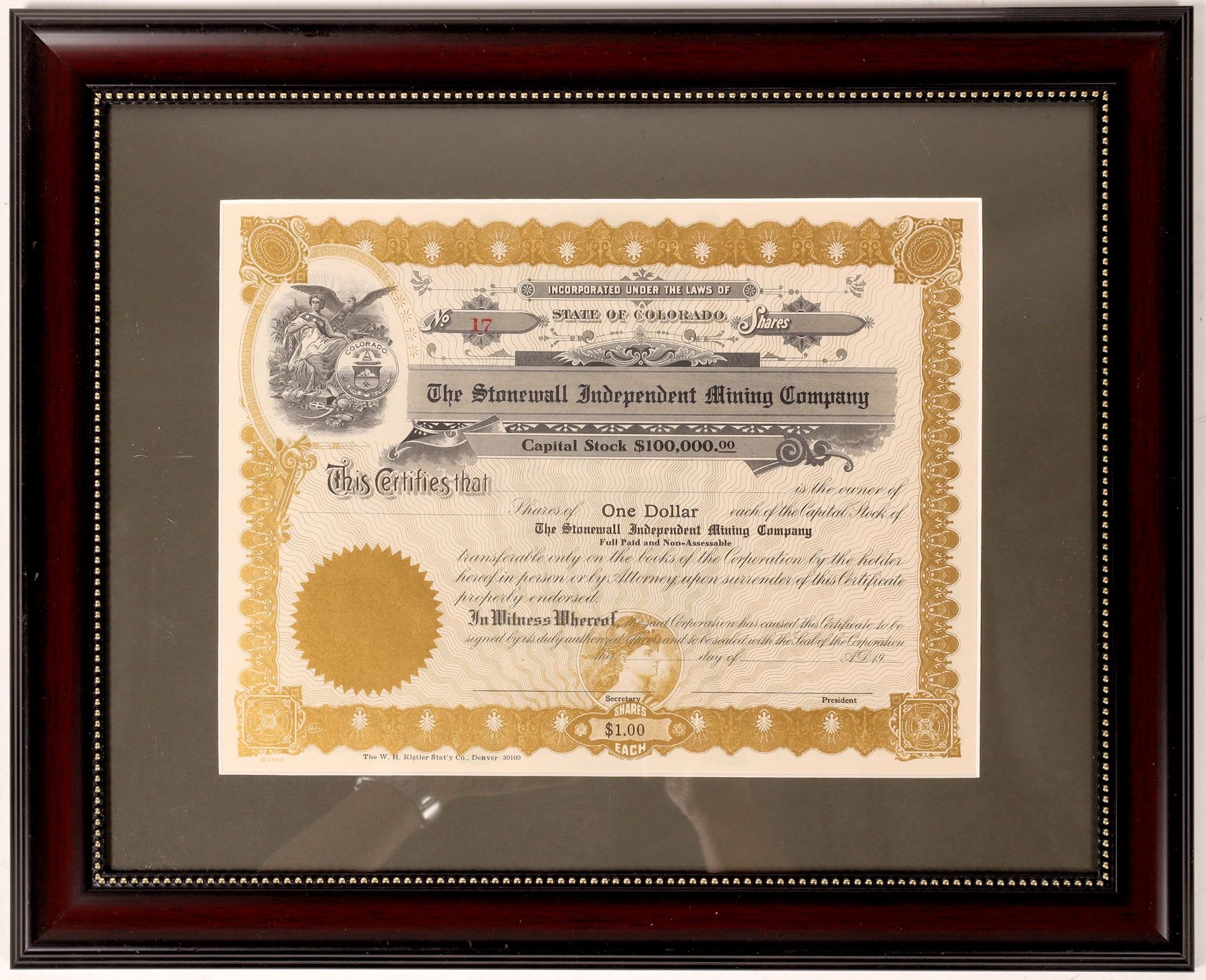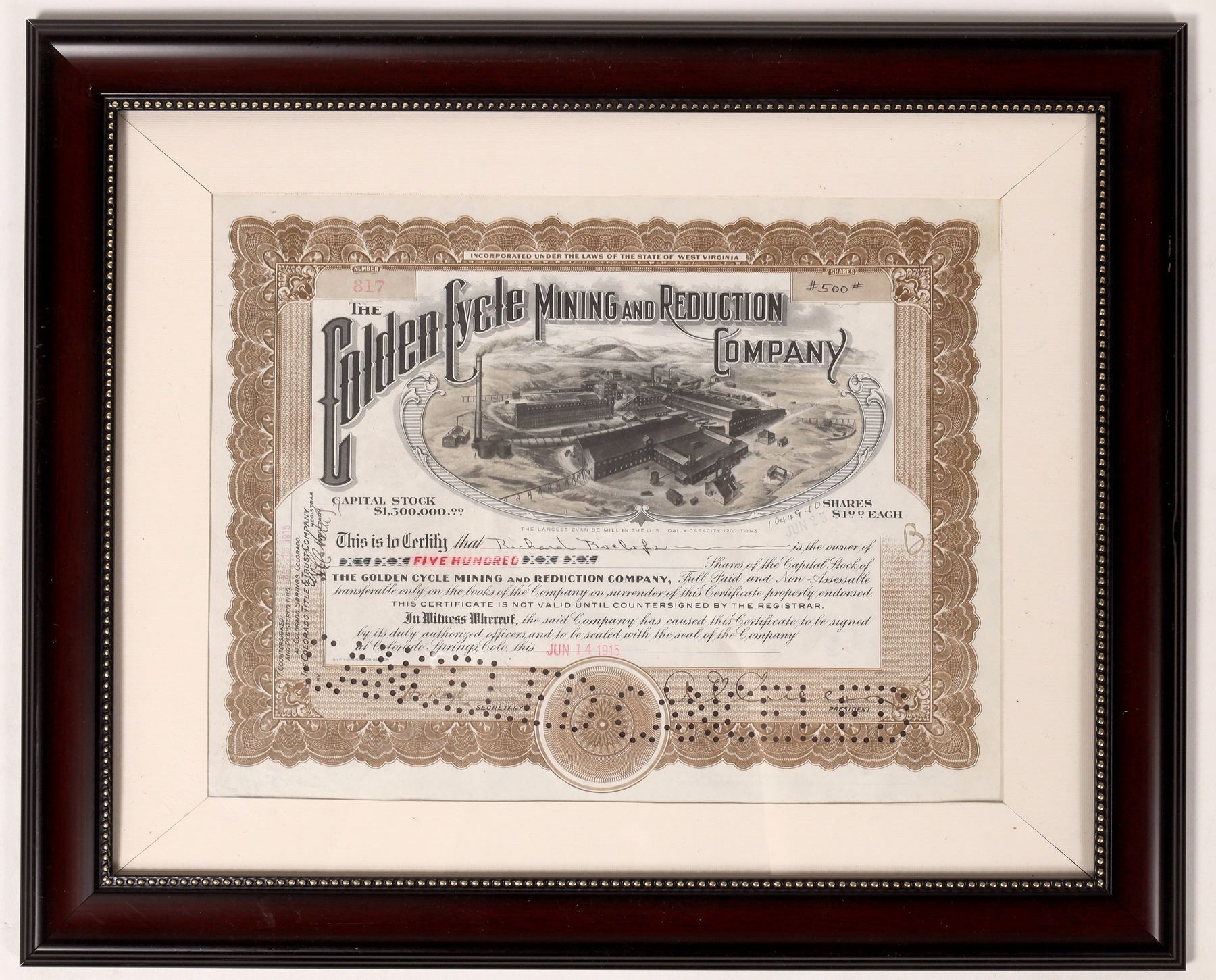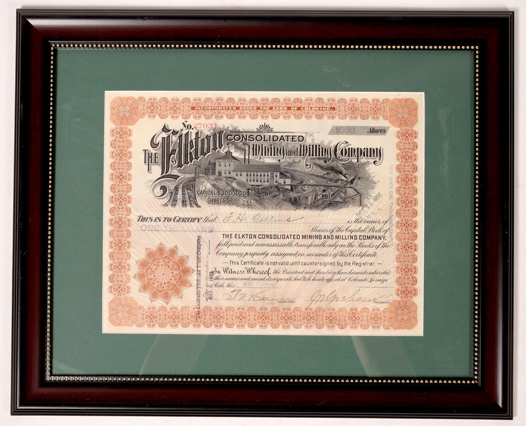5 different Cripple Creek mining stocks in nice frames. Isabella Gold Mining 1897. Golden Cycle Mining 1915. Elkton Cons. Mining 1905. Stonewall Independent Mining 1900's. Ironclad Mining 1900. Frames 12.5x15.5"