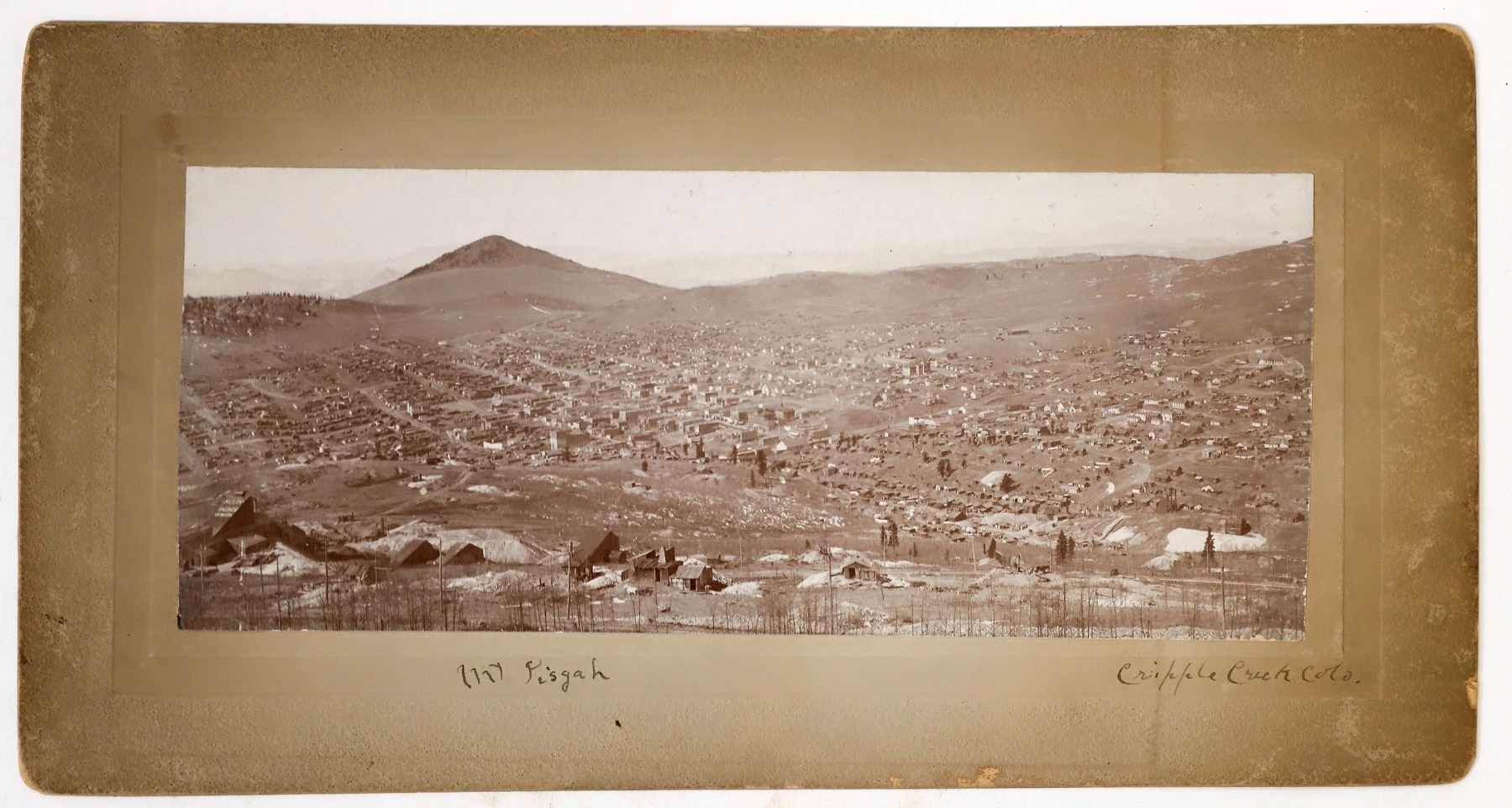 Panorama of Cripple Creek, Colorado. This panorama shows the whole town with Mt. Pisgah in the background. Taken from the hillside to capture a nice birds' eye view. "Capitol Hill" is inscribed on the backside. This photograph was probably taken in the early 1900s, possibly 1908 or later. 12.75 x 6.5 inches. Good condition.