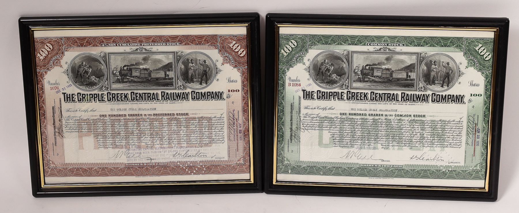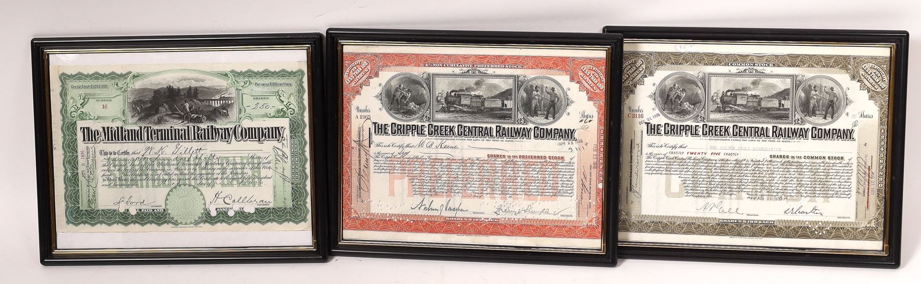 Lot of five stock certificates from two different Cripple Creek railroad companies. These companies are the Midland Terminal Railway Company (1 from 1896) and the Cripple Creek Central Railway Company (4 from the 1930s). All four from the Cripple Creek Central are different colors. All five are pictorial. These pieces were originally part of a historical exhibition called "Rush to the Rockies, Pikes Peak or Bust!" All are individually framed, 12 x 9.5 inches each. Good condition.