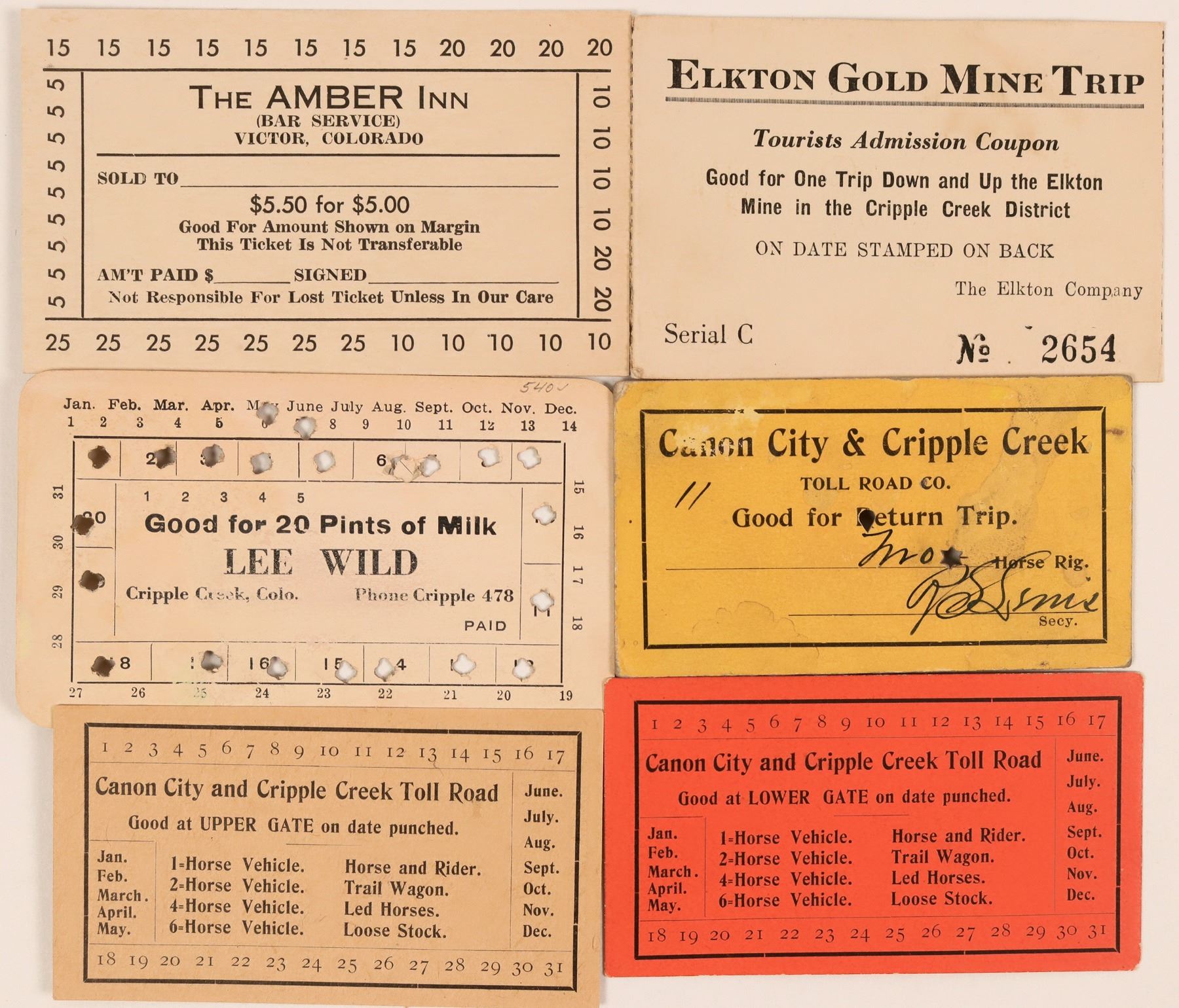 Five pieces of cardboard tickets from Cripple Creek: Canon City & Cripple Creek Toll Road, Elkton Gold Mine Trip, Lee Wild; and The Amber Inn, Victor, Colorado.