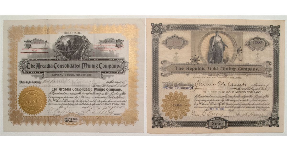 Lot of 2. 1) Arcadia Consolidated Mining Company. Incorporated in Colorado in 1896. Cert. #2816 issued to Romiette Howard for 1000 shares. Signed by F.F. Roby, president, and W.A. Baldwin, asst. secretary. Datelined Colorado Springs. Gilt border and seal. Printer not noted. This company was owned and controlled by W.S. Stratton. The property was located on Gold Hill on the east edge of the town of Cripple Creek [Hills, pp. 63, 442-443]. VF. 2) Republic Gold Mining Company. Incorporated in Colorado in 1896. Cert. #2858 issued to James McCombs for 1000 shares. Signed by H. S. Hawks, vice president, and Geo. O. Tapley, secretary. U/C. Printer not noted. Datelined Colorado Springs. VF. Mining History in American #10116. Date c1896 Cripple Creek, CO hwac 9992