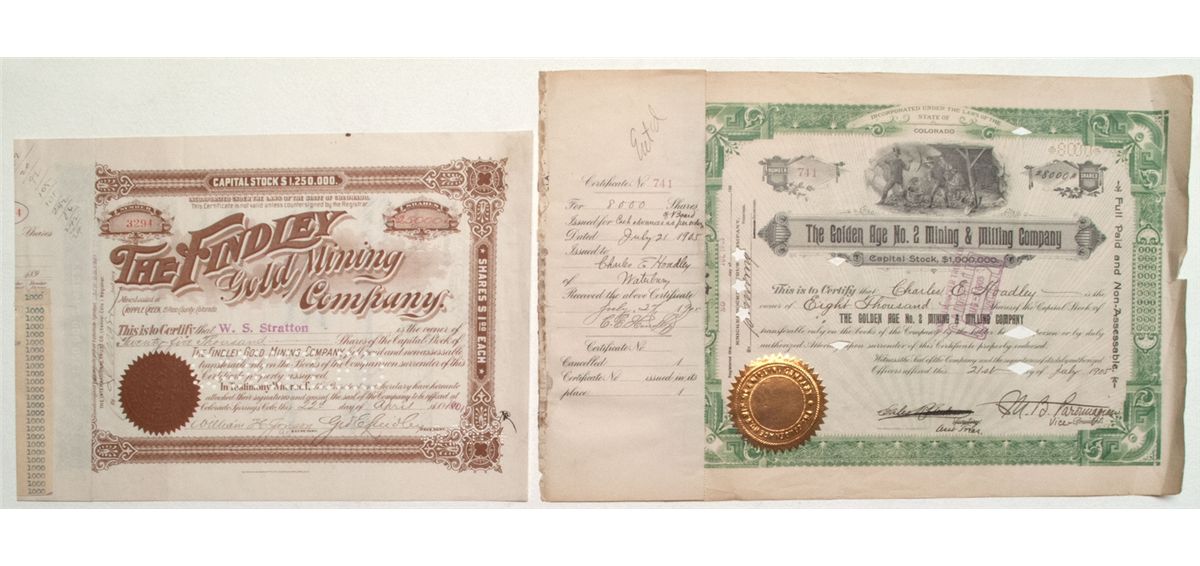 Lot of 2. Cripple Creek District. 1) Findley Gold Mining Company. Incorporated in Colorado. Cert. #3294 issued to W.S. Stratton in 1901 for 25,000 shares. Signed by Geo. E. Lucidley, president, and William H. Jonson, a. secretary. Cancelled. Printer: Gowdy-Simons Ptg. Co., Colorado Spgs. Stub is re-glued to left end and has a typed list of the 25 recipients of shares of this certificate at $1000 each. Comes with a photocopied short biography of Winfield Scott Stratton. 2) Golden Age No. 2 Mining & Milling Company. Incorporated in Colorado. Cert. #741 issued to Charles E. Hoadley in 1905 for 8000 shares. Signed by Vice President M.B. Parounagianu and Asst. Treas. Giles Peterson. Cancelled. Printer: Broun-Greer Co., New York. Green border, gilt seal. Stub has been re-glued to left end. Both VF. Date 1901, 1905 Cripple Creek, CO hwac 9985