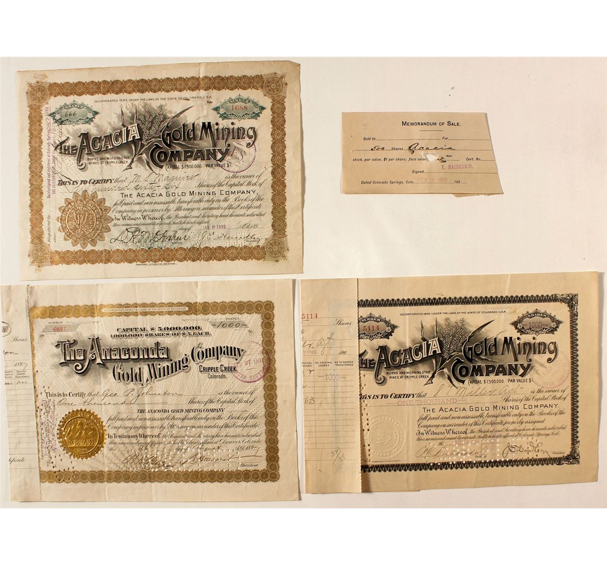 Three certificates from mines located in Teller County, Cripple Creek, CO. Incorporated under the laws of the State of Colorado. Two from The Acacia Gold Mining Company, dated 1899 and 1900. "Burns and Morning Star Mines at Cripple Creek," signed by John E. Hundley as President. Properties located on Bull Hill, company absorbed the Calumet Gold Mining and Milling Company (The Official Manual of the Cripple Creek District, 1900, p.34). The Anaconda Gold Mining Company, dated 1897. Owns a variety of mines including Lone Star, Lone Star 2 and 3, Rustler, Superior, and Excelsior on Gold Hill (Manual of the Cripple Creek District, 1900, p.55). All cancelled by punch and stamp. Date , CO hwac 20925