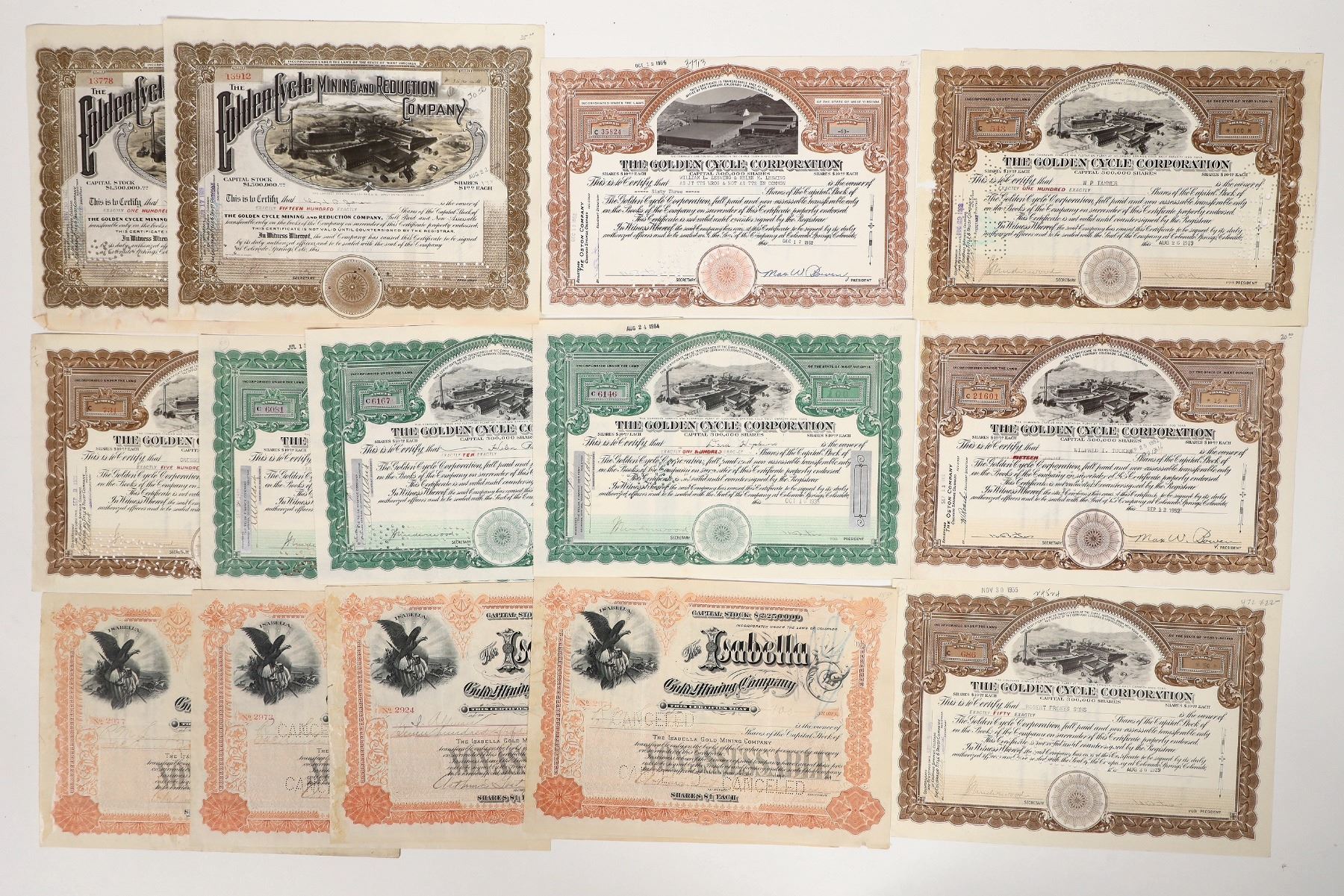 Issued-8x green and brown Golden Cycle, 5x 1890's-1900 Isabella Gold-4 with Percy Hagerman sigs, 1927-28 Golden Cycle Mining and Reduction with stains.