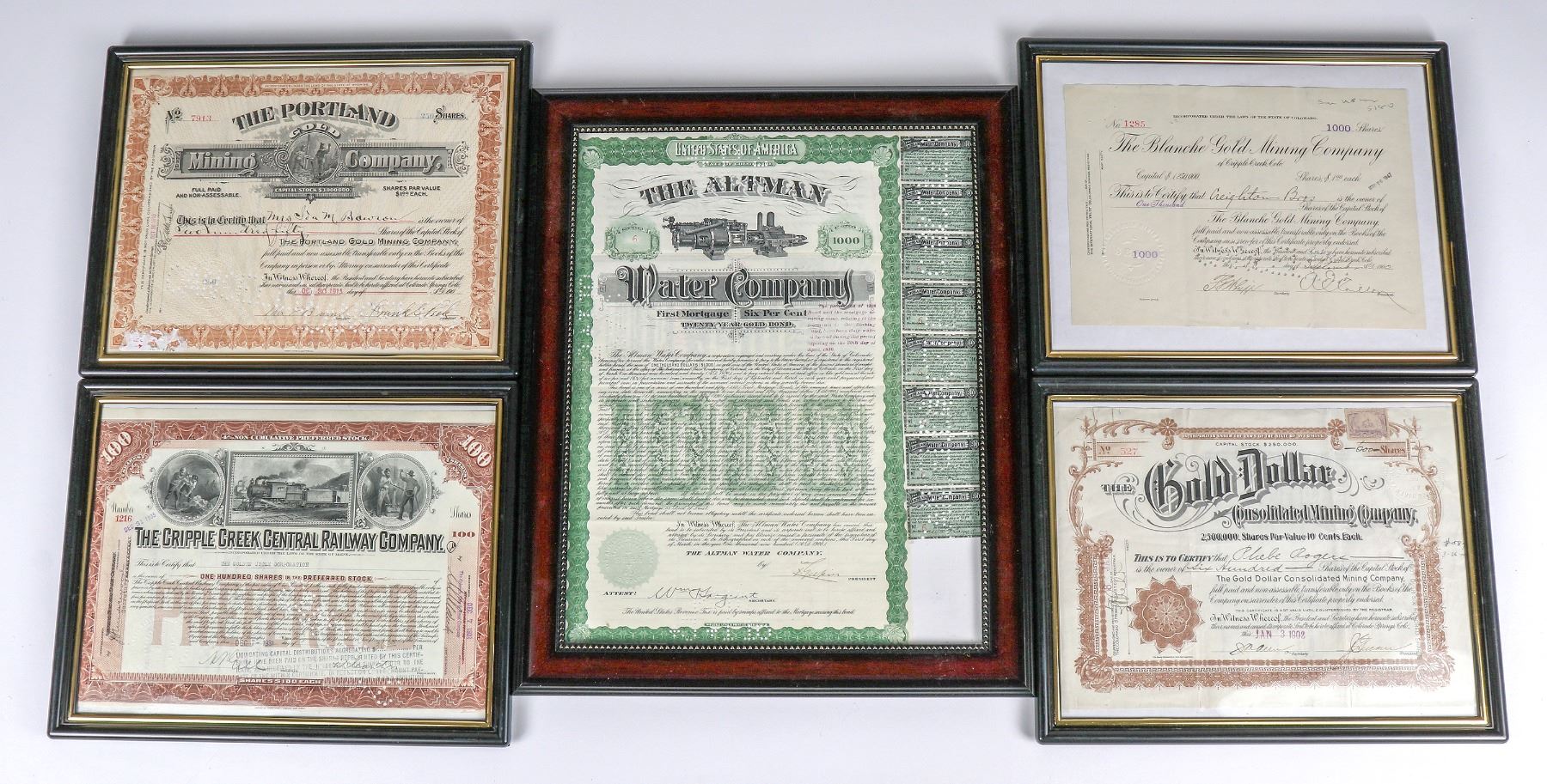 5 Cripple Creek in frames. Central Creek Central Railway, Gold Dollar Cons. Mining, Blanch Gold Mining, Portlant Gold. Altman Water bond. Cripple Creek Colorado