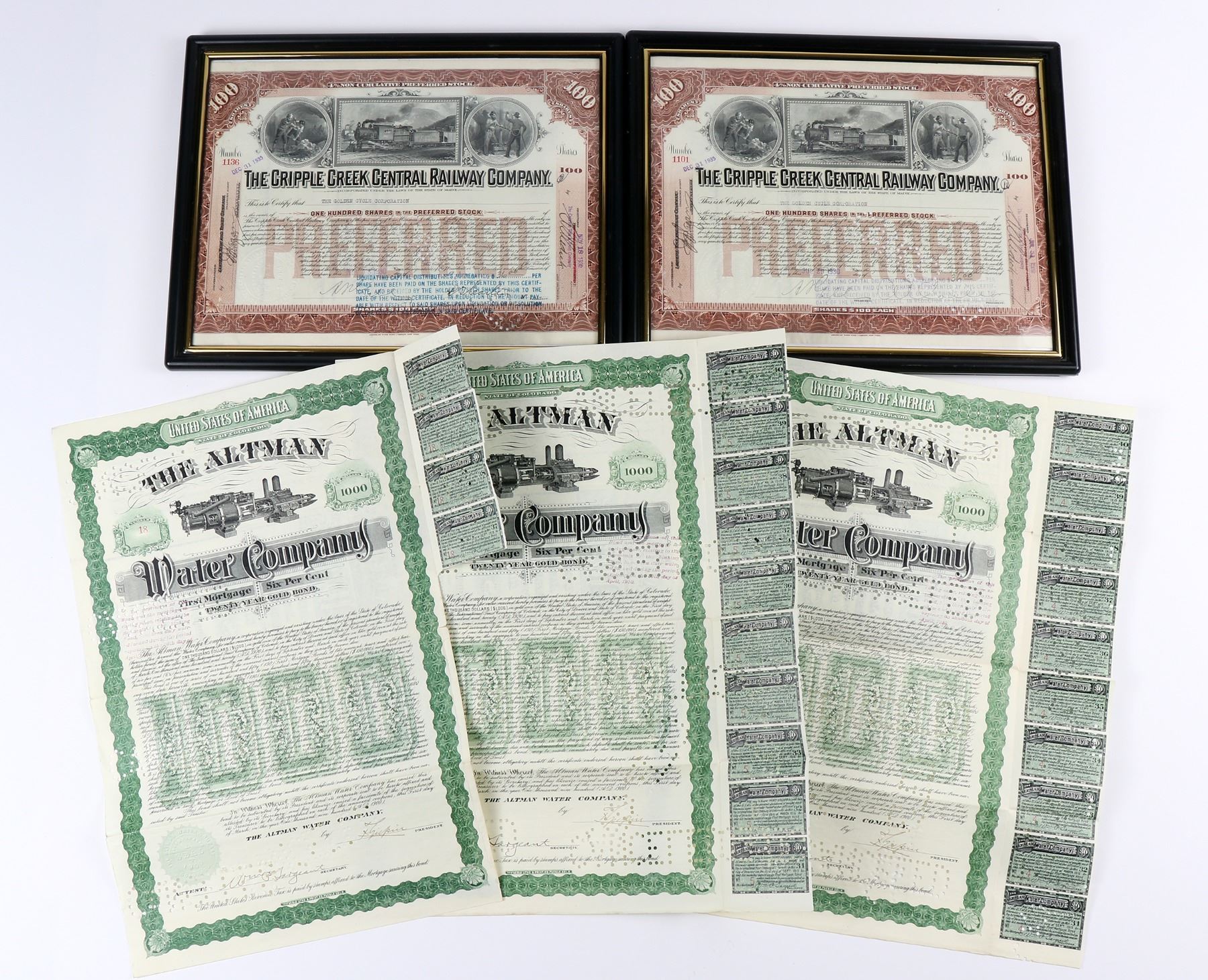 Cripple Creek stocks in frames, 2x Cripple Creek Central Railway. 3x Altman Water bonds unframed. Colorado Cripple Creek