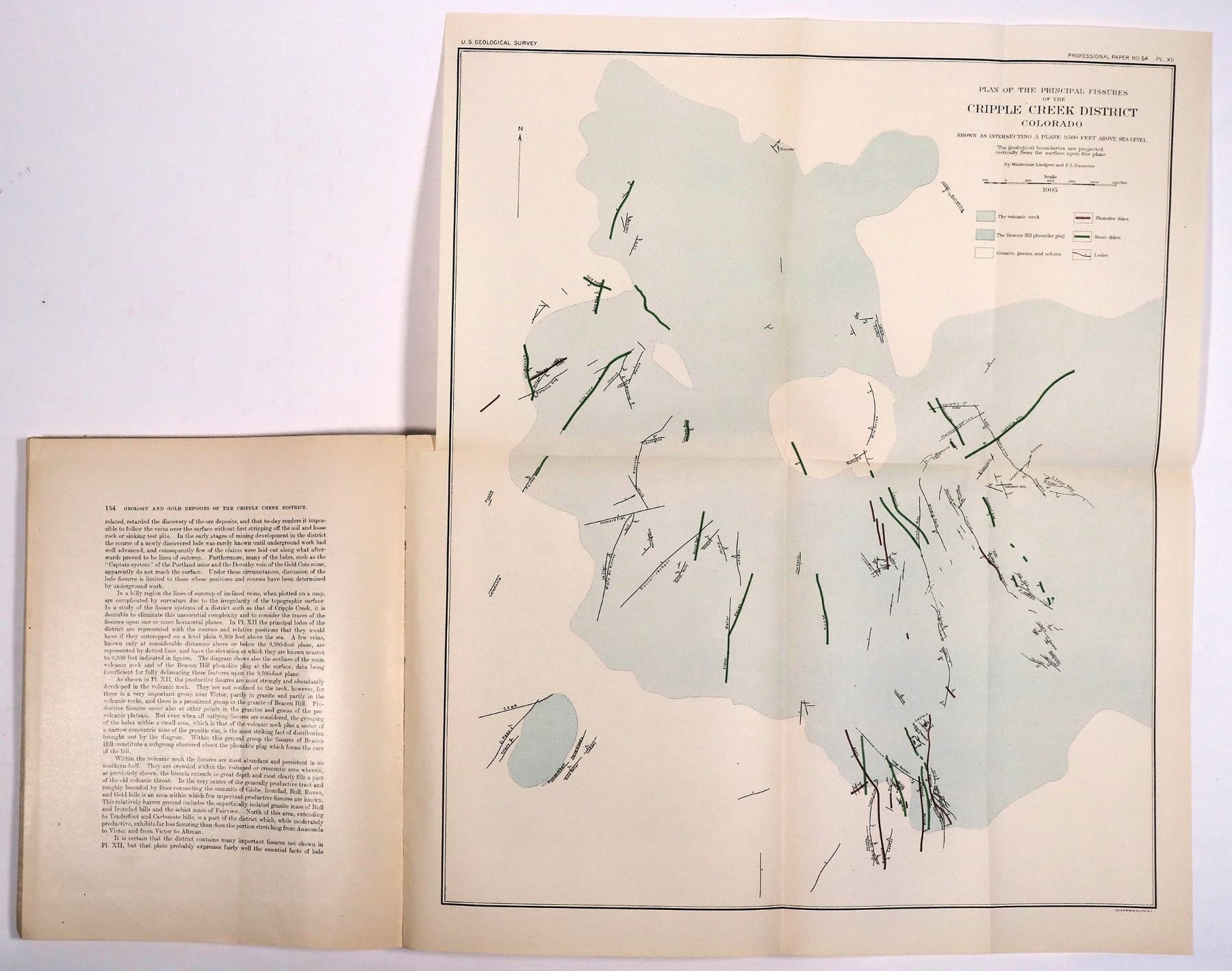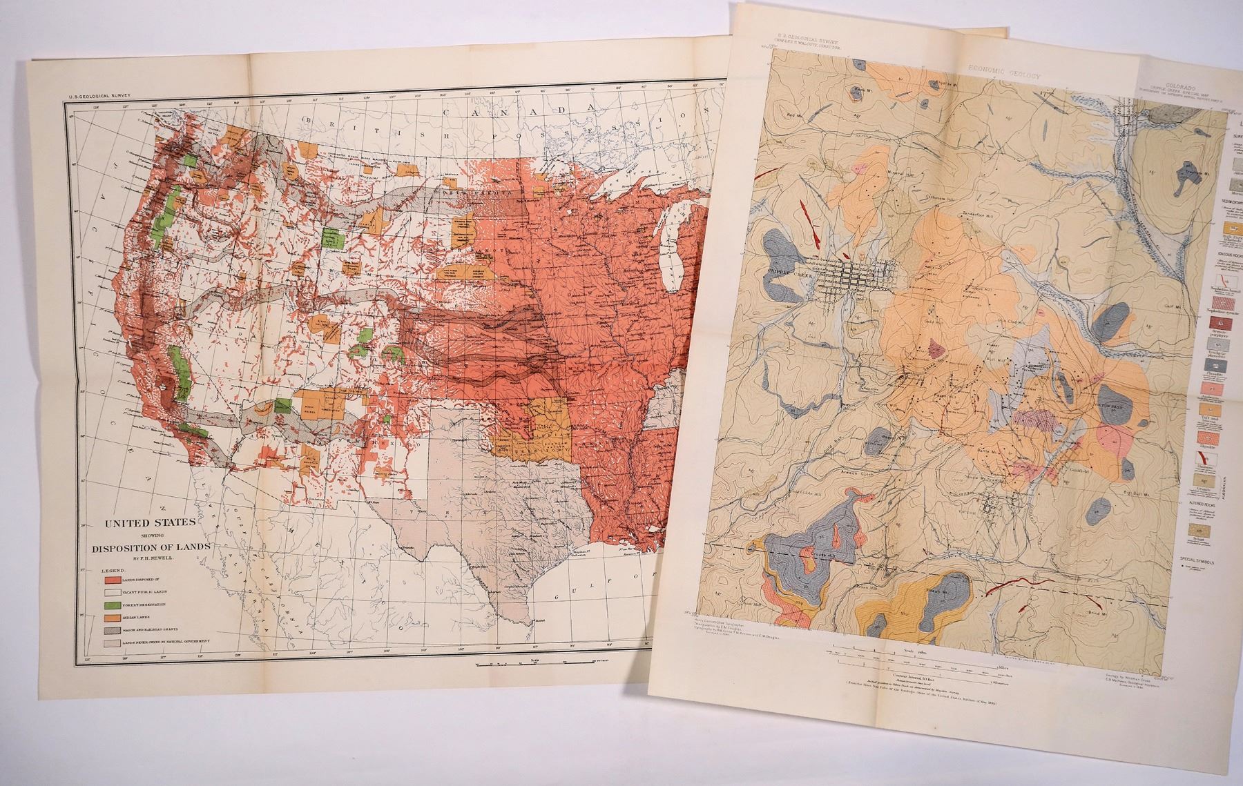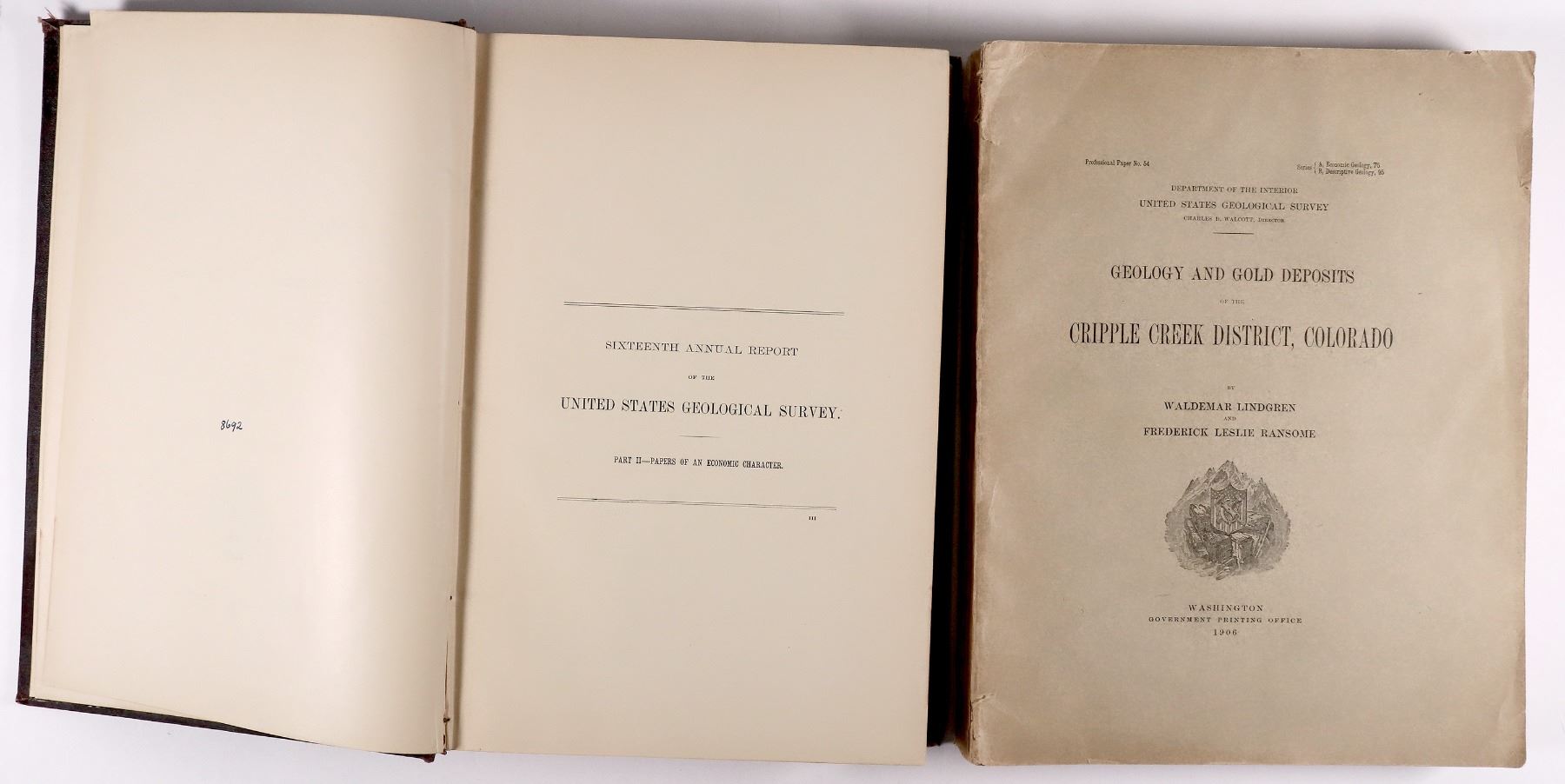 Hardcover 1895 Annual Report of the USGS to the Secretary of the Interior, Part II, Papers of an Economic Character, 598pp with index. Softcover 1906 USGS Geology and Gold Deposits of the Cripple Creek District, Colorado, 516pp with index. Back envelope empty.