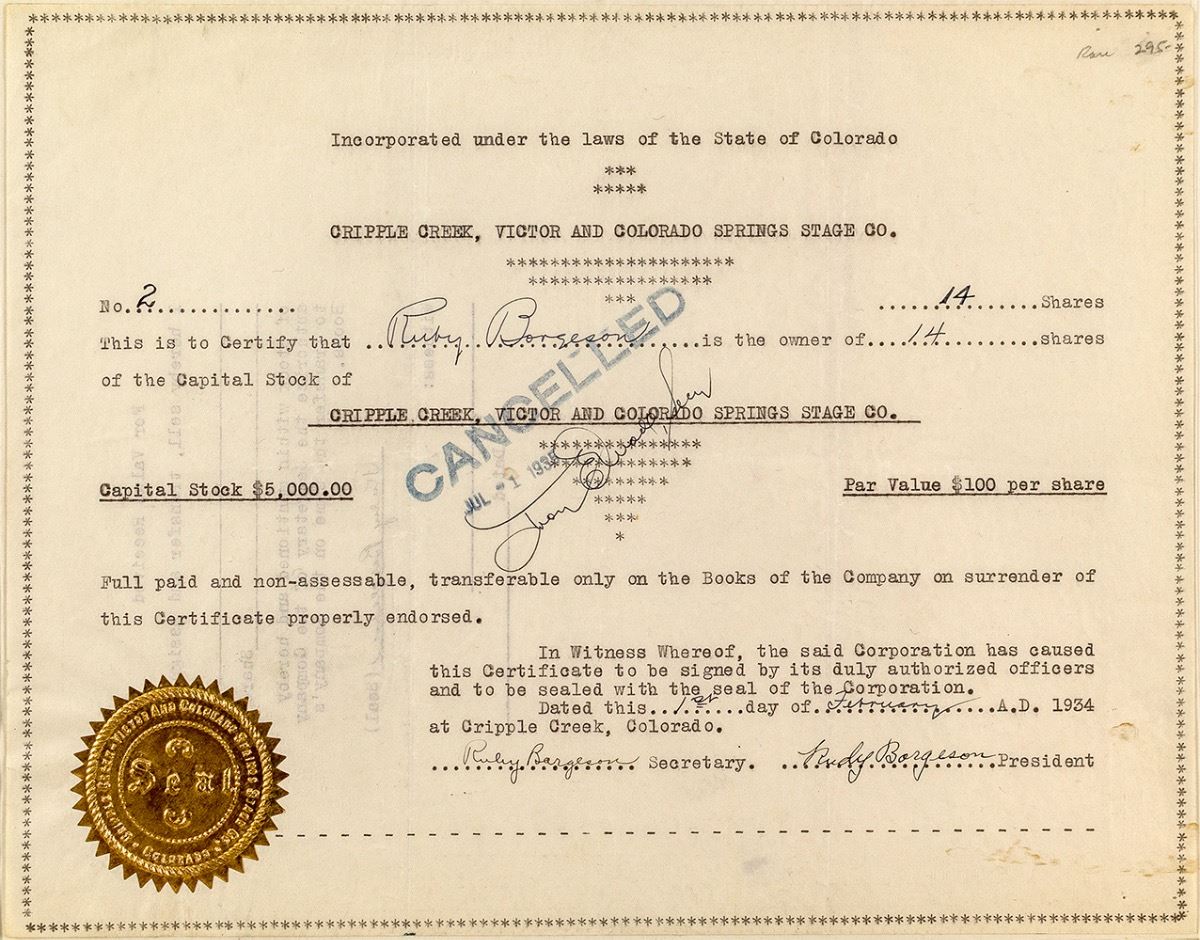 Rare. Inc. in Colorado. Low certificate No. 2, issued for 14 shares to the company secretary, Rudy Borgeson, and also signed by the president, Rudy Borgeson. Stamp cancelled. Gold seal, otherwise a very plain style certificate. Using a custom-built 8-passenger automobile, this company hauled freight, delivered Montgomery Ward catalogs, and transported people. (Prag Collection) City: Cripple Creek State: Colorado Date: 1934 hwac# 34211