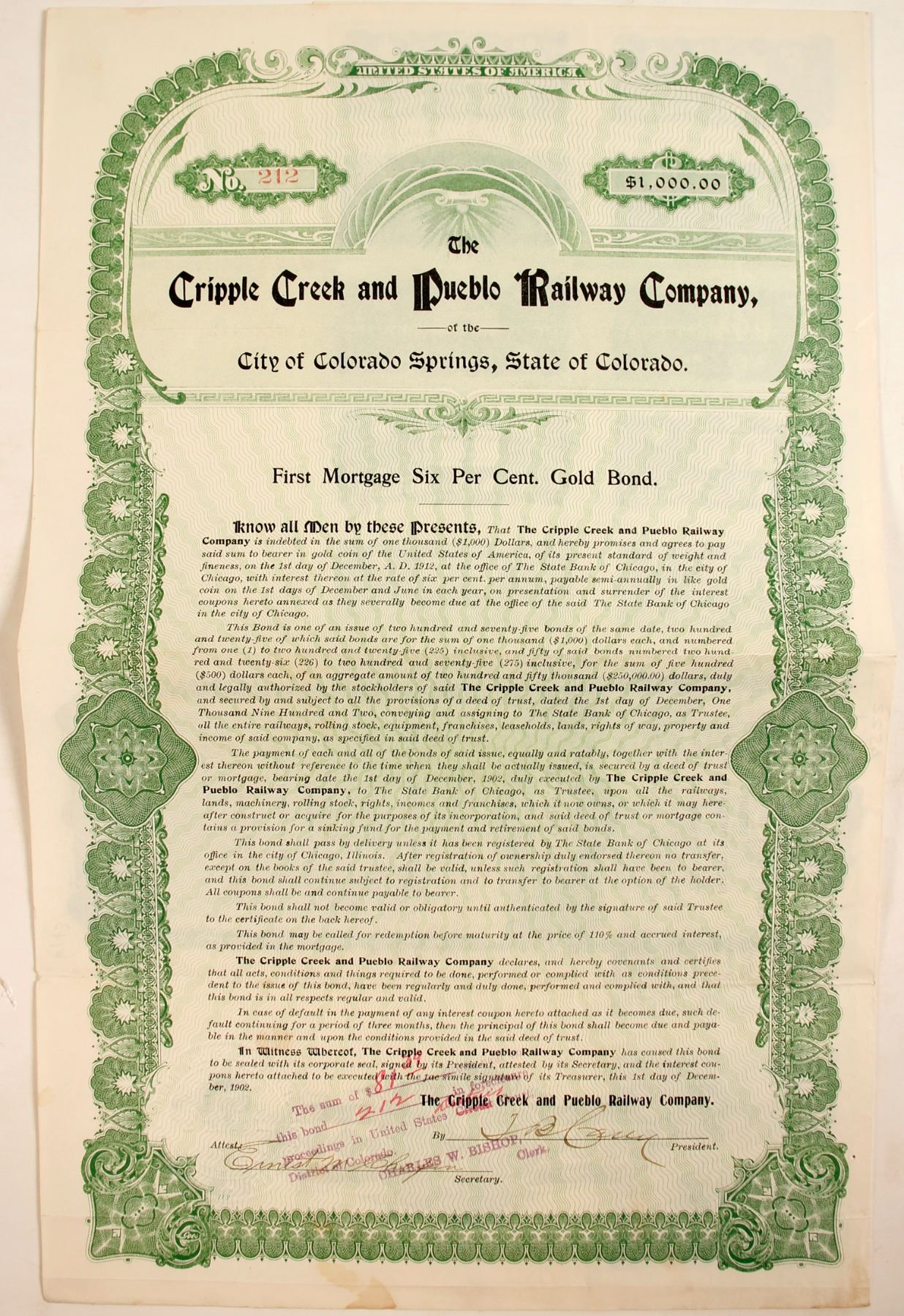 Bond from Cripple Creek and Pueblo Railway Company in Colorado Springs, Colorado. Bond Number 212 was for $81.39 by Charles W. Bishop, clerk. to be paid at $1,000 with coupons. Excellent condition