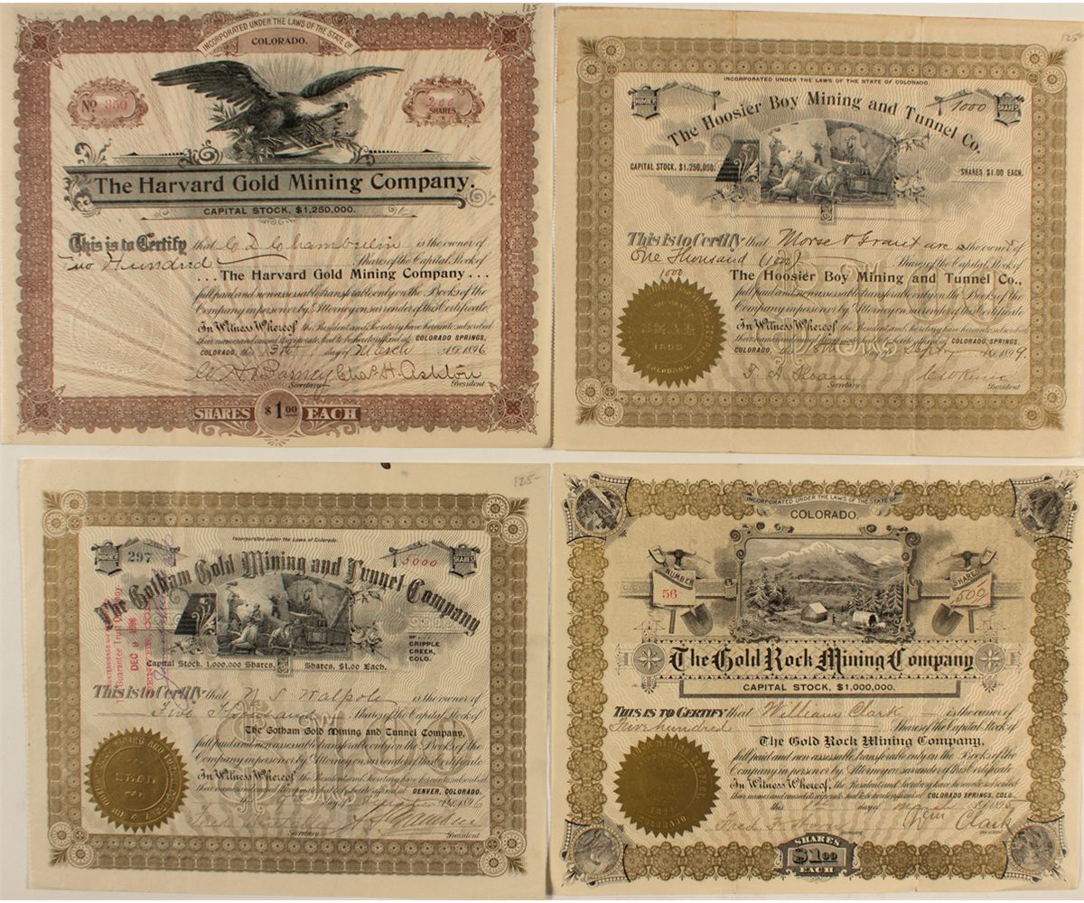 Lot of four. 1) Hoosier Boy Mining and Tunnel Company. 1000 shares to Morse and Grant. 2) Harvard Gold Mining Company. Number 350 for 200 shares to Chamberlin. signed by W Barney and Charles Ashton. 3) Gotham Gold Mining and Tunnel Company. Number 297 for 5000 shares to N Walpole. 4) Gold Rock Mining Company. Early number 56 for 500 shares to William Clark. Signed by President Clark. (Prag collection)