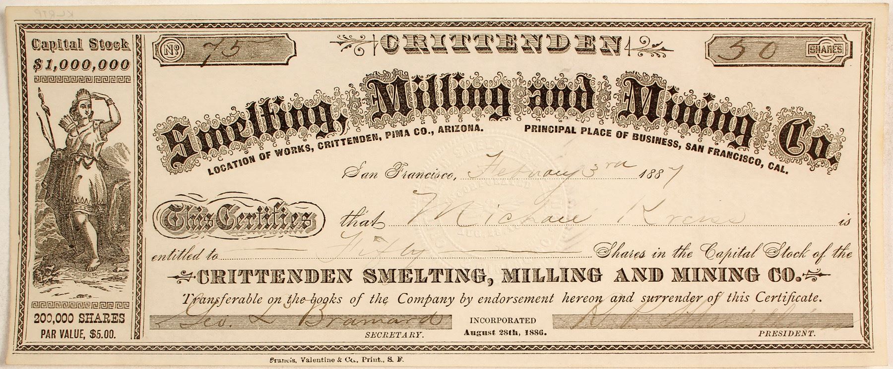 Number 75 for 50 shares to Michael Kneiss. Signed by George L Bramard and RP (?). Endorsed on back. Vignette at left end of allegorical Indian maiden. U/C. Printer: Francis, Valentine & Co., S.F. Datelined San Francisco. 4 x 9 ½.” Crittenden (now a ghost town) was originally known as Casa Blanca, mainly known for its rail depot and mining. Mint condition with minor yellowing, trimmed tight at left. Comes with history of Fort Crittenden and the town of Crittenden. Very Fine Condition: no edge or corner issues, no folds, no discoloration, no pinholes. Uncancelled. (Laguna Collection) HWAC# 62275 Date: 1887 Location: Santa Cruz, Arizona