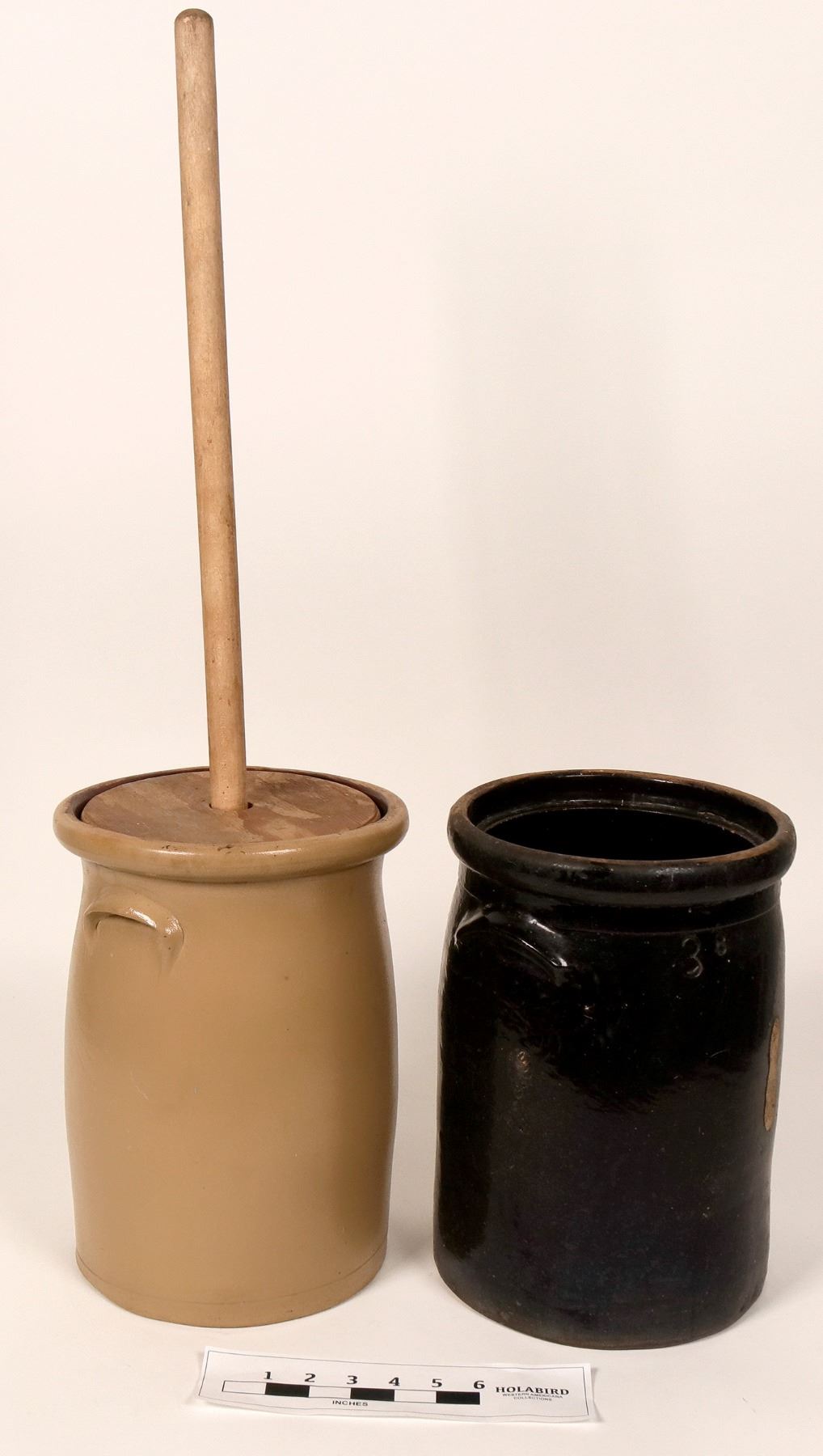 Two nice crock butter churns. One with paddle, but it can be interchanged to the other. Both churns measure 13"x 9". There is some chipping and wear but they are both in generally good condition. See photos for more details.