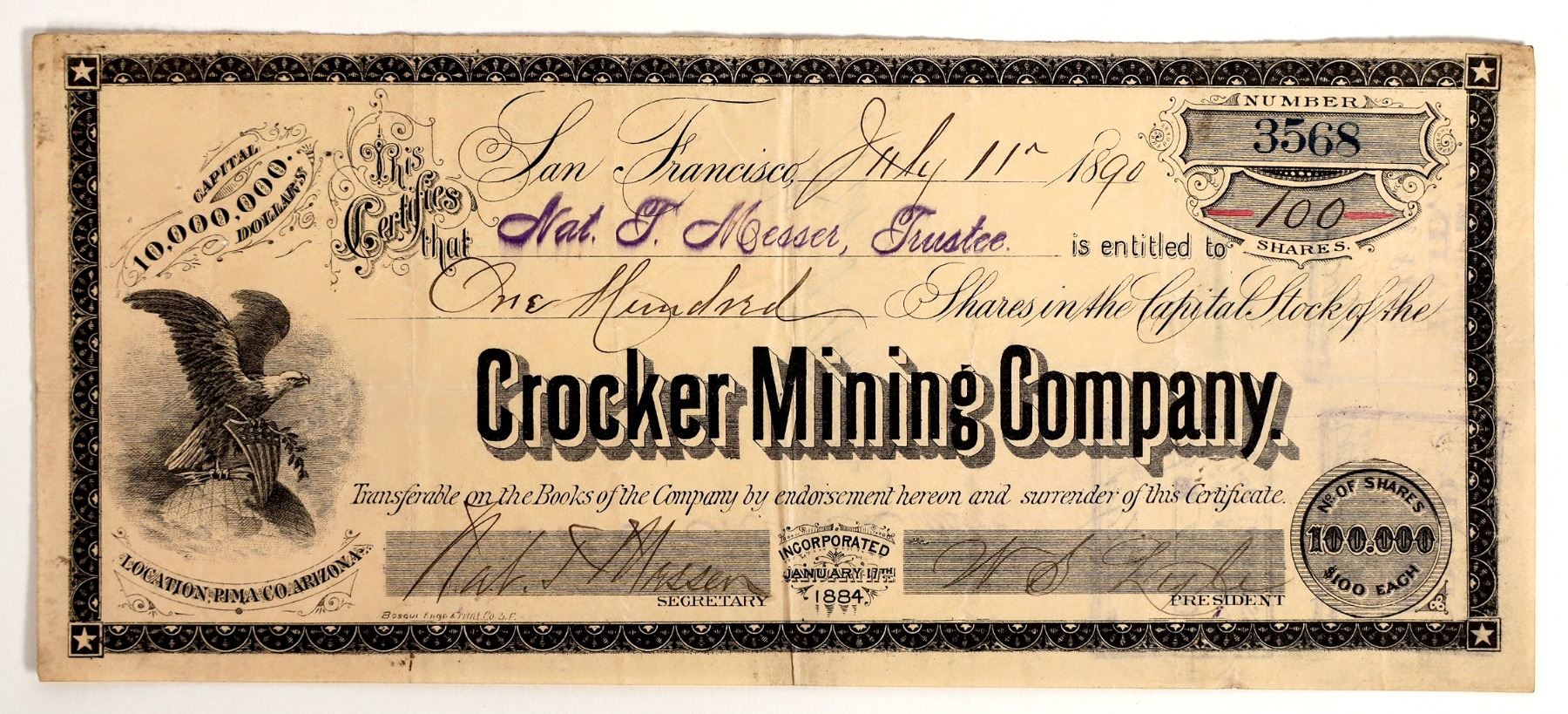 "Location: {Pima Co., Arizona" (printed at bottom left). Inc. 1884. No. 3568, issued for 100 shares to secretary Nat. T. Messer in 1890 in SF. Signed by president WS Lyle and Messer. Not cancelled. Eagle on globe vignette. Folds, pinholes. Operated at Quijotos, Pima County, according to numerous newspaper articles at that period.