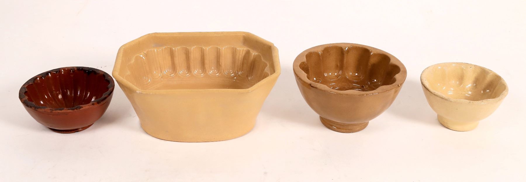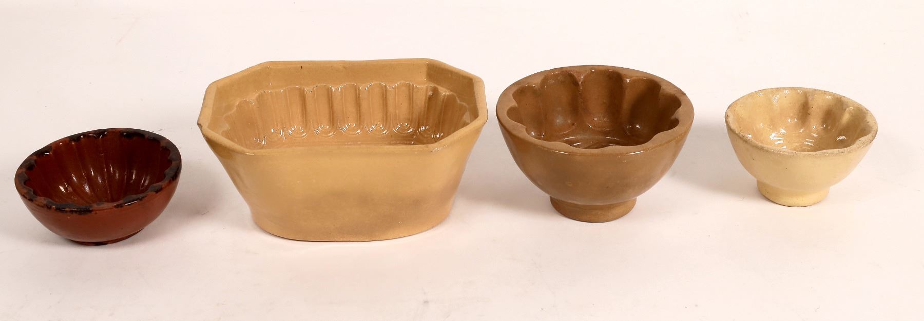 4 crockery mods-3 small ones with swirl pattern, rectangular one has corn cob pattern-1.25" base chip and 3 lip chips. 4.25-7.5".