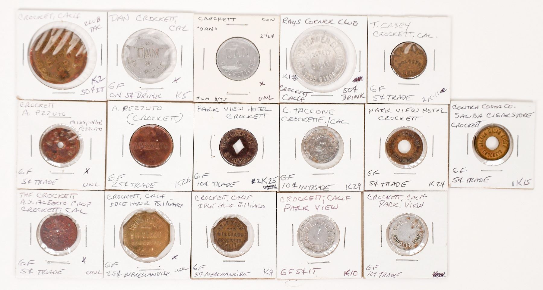 17 Crocket(t) tokens. K2, K5, unlisted Dan, K9, unlisted Idle Hour Billiards, unlisted The Crocket, K13, K10, unlisted Park View, K11, K15, K24, K25, K26, unlisted A Pzzuto, K29. California Crocket