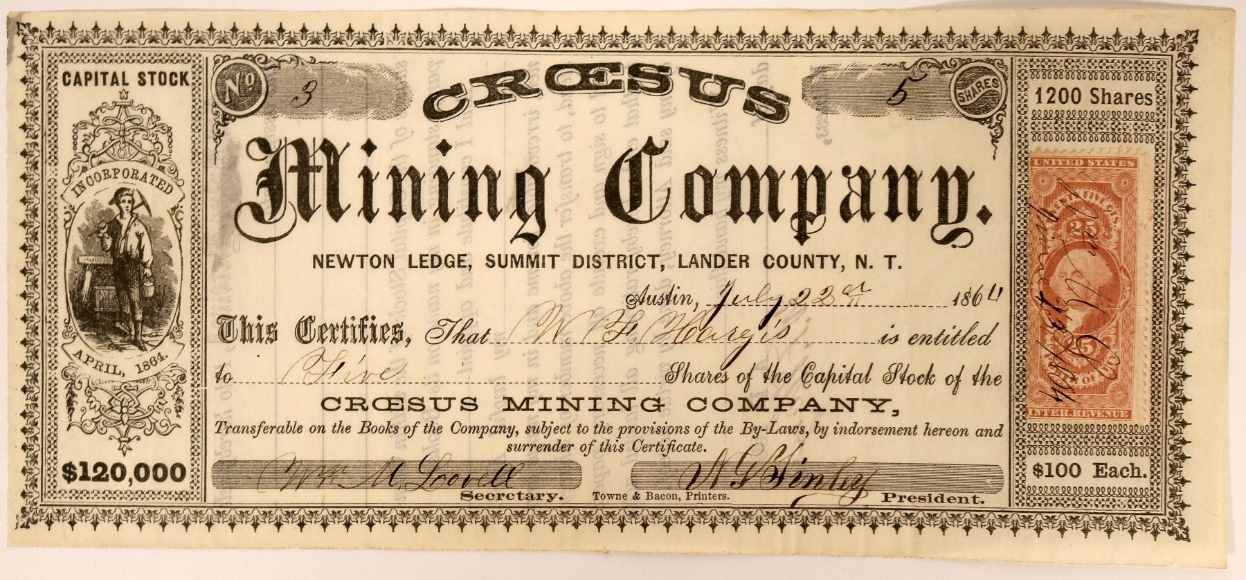 NUMBER 3 for 5 shares to W Cargis(?). Signed by William M Lovell and president Finley. Dateline Austin 1864. Incorporated April 1864. Not cancelled. 25c revenue stamp. Miner with pick vignette. Towne & Bacon printer. Small tear bottom right. Discoloration top left bleed from back. Very nice. Location: Newton Ledge, Lander County, N. T. The Summit district was organized at the foot of Bunker Hill on Kingston Creek (Smoky River or Smoky Creek) sometime prior to 1866. The district is sometimes divided into the Santa Fe district, on the north, and the Bunker Hill district, on the south. Ken Prag Collection