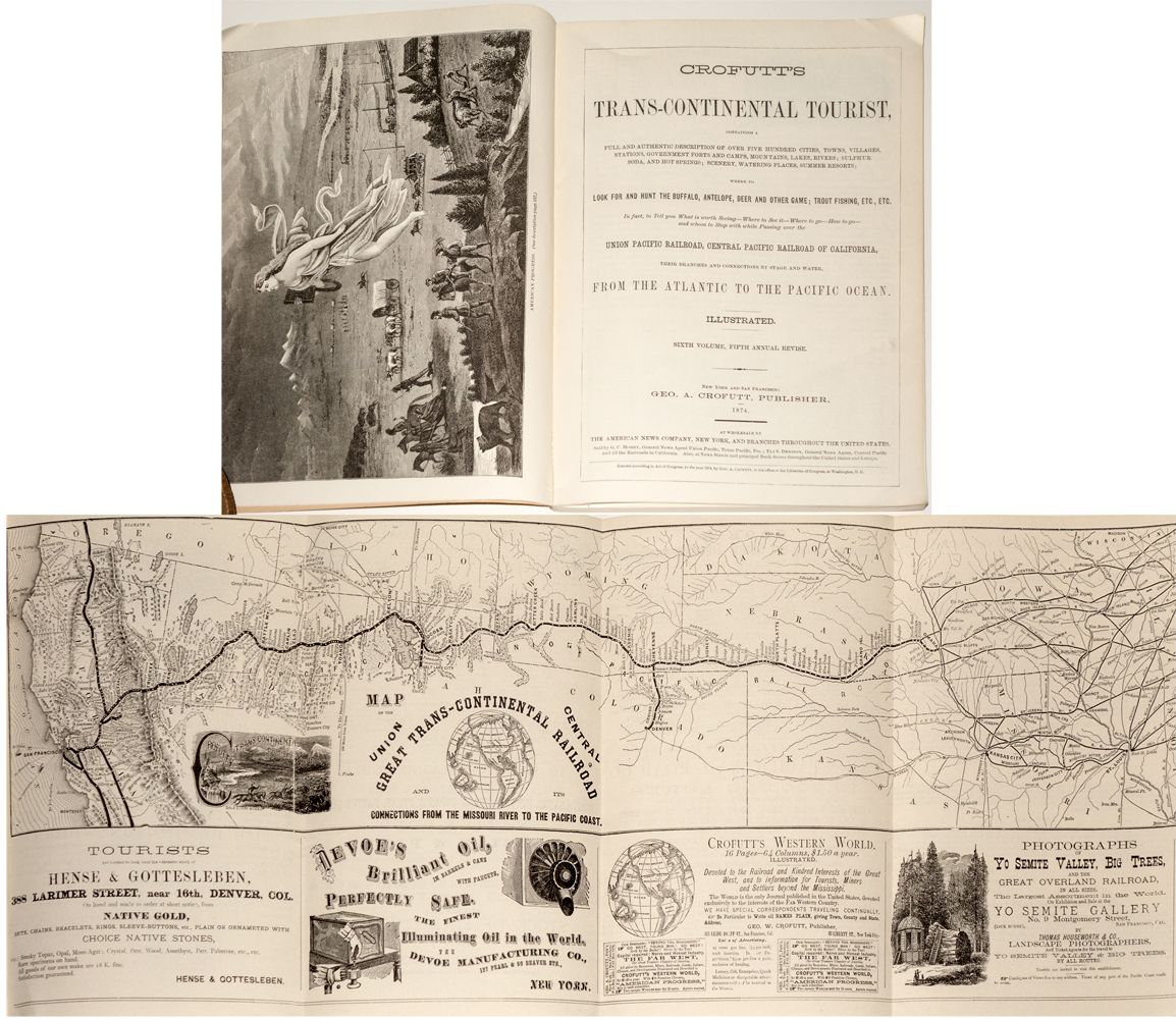 Originally printed by Geo.A. Crofutt in 1874. Great guide "In fact, to Tell you What is worth Seeing - Where to See it - Where to go - How to go - / and whom to Stop with while Passing over the/ Union Pacific Railroad, Central Pacific Railroad of California/ From The Atlantic To The Pacific Ocean." Filled with great illustrations, advertisements, and pull-out maps and time tables. Softcover, reprint, 162 pages.