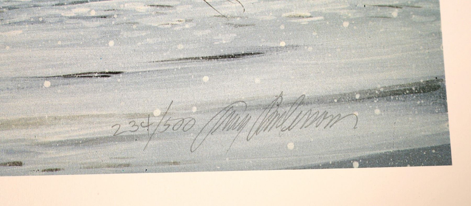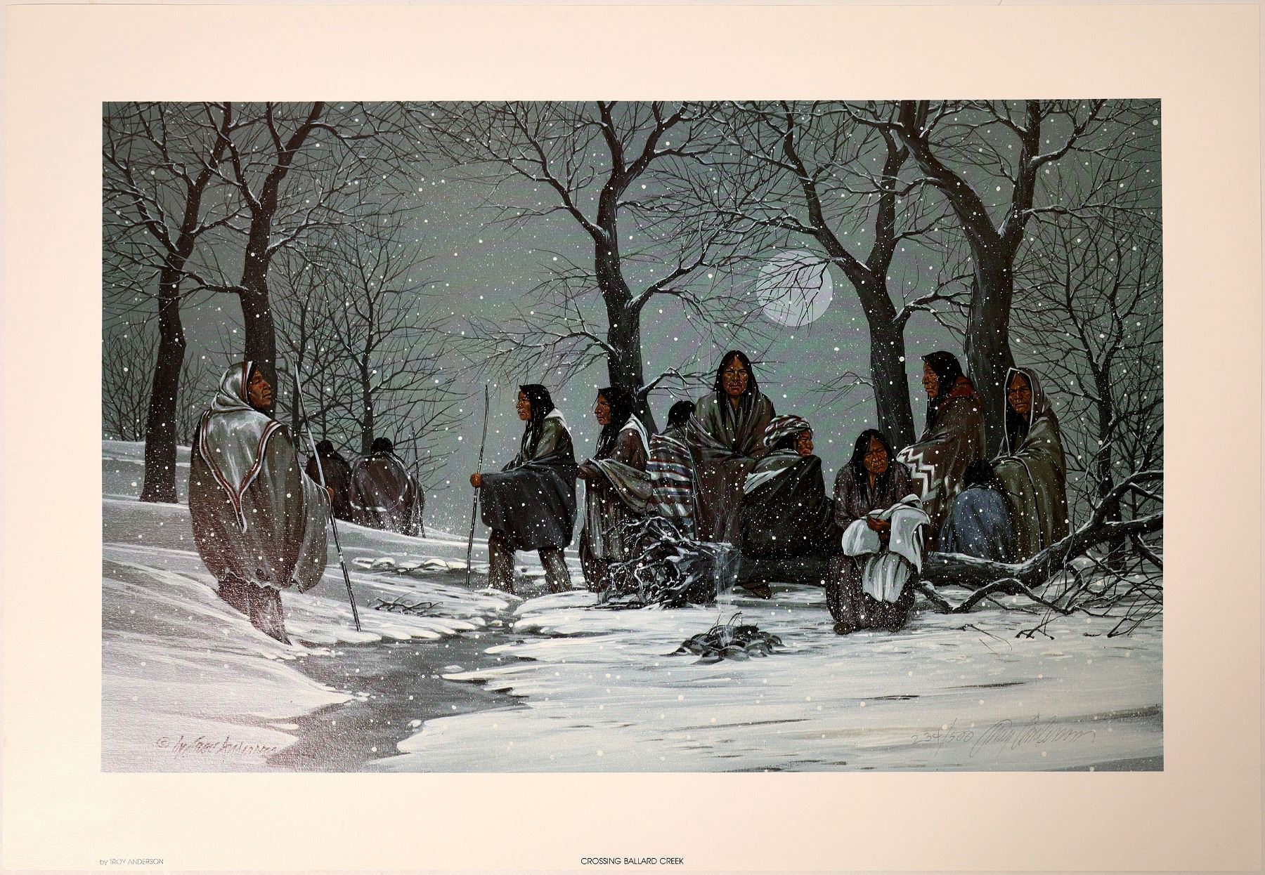 Native Cherokee, Troy Anderson works in both painting and sculpture. This print is 234/500. Native Americans crossing a creek at night in snowfall--beautifully painted.