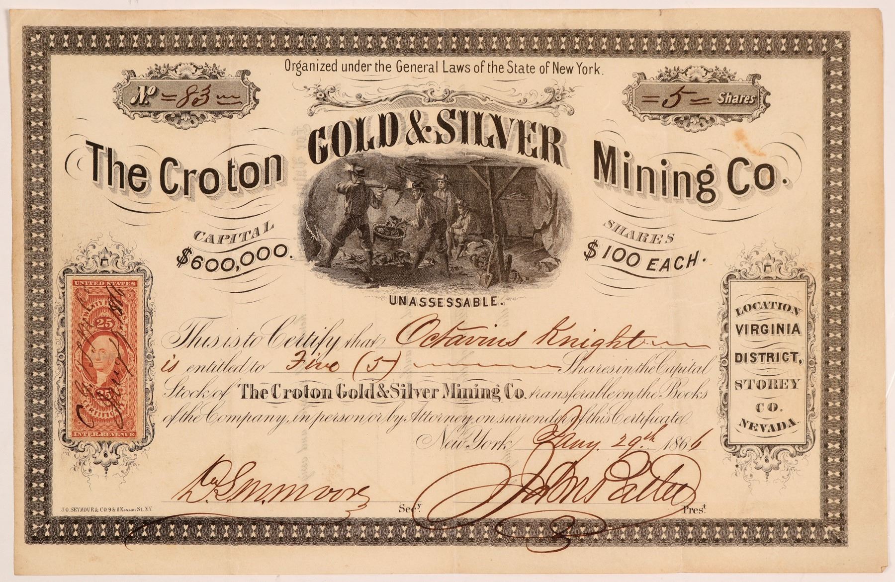 Rare Comstock. I/U #83 Octavius Knight 5 shares, Signed by Moore as secretary, and Pattee as president. RN stamp