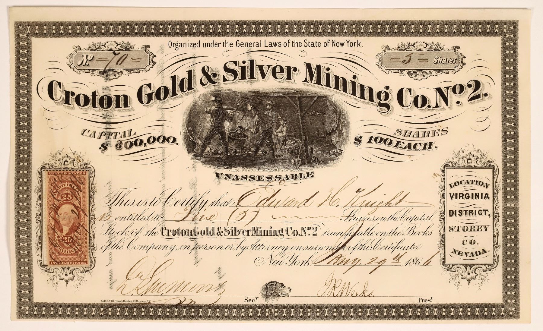 RARE Comstock. #70 for 5 shares to Edward Knight. Signed by Moore as secretary, and Weeks as president. RN stamp. Incorporated in New York in 1865. Vignette of four working miners. Not cancelled. Black border and print. No corner, edge, discoloration of pin hole issues. Certificate says, Location, Virginia District, Storey Co., Nevada.