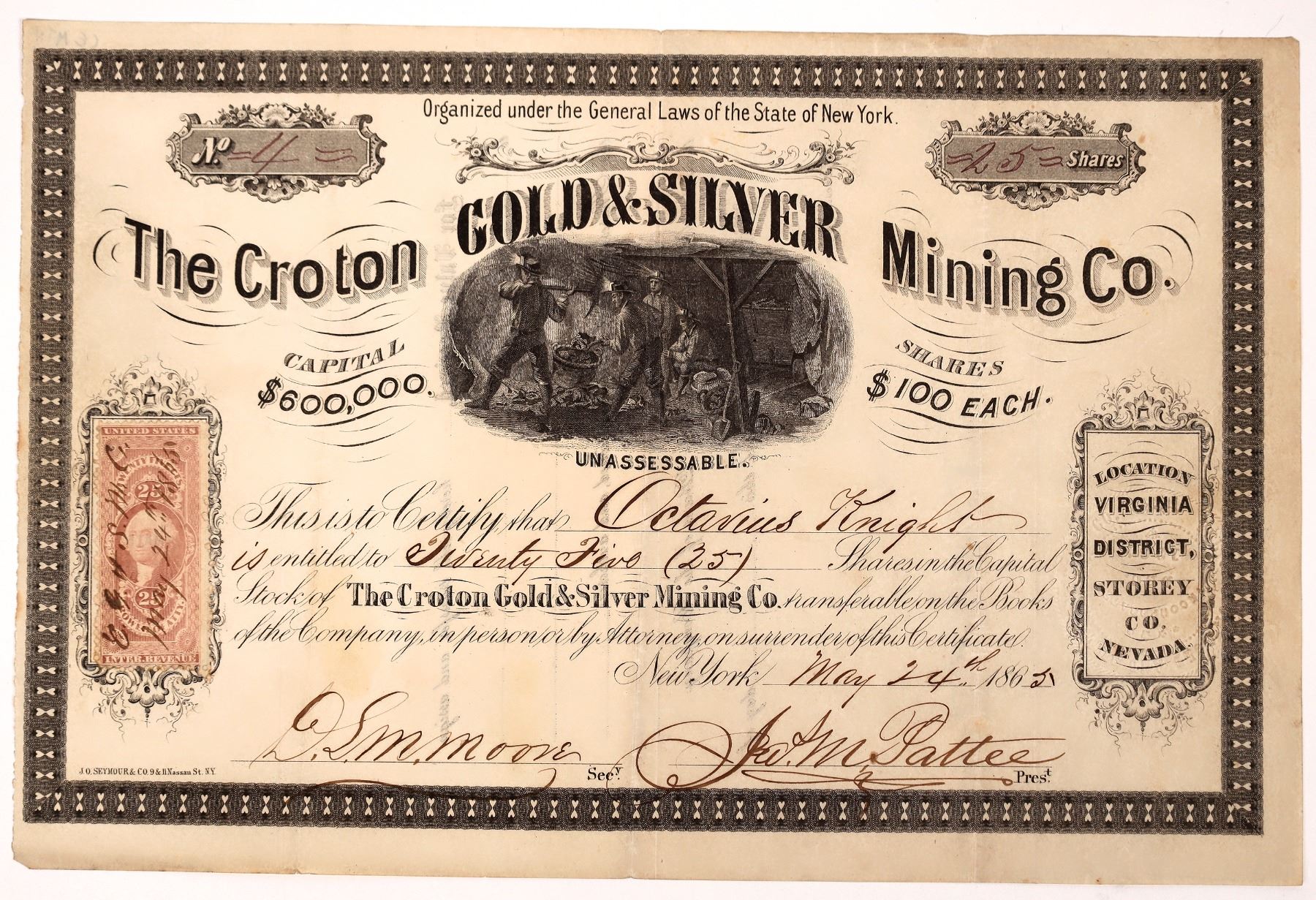 Croton Gold & Silver Mining Co. - Virginia City, NV - Storey County - May 24, 1865 - Stock Certificate - Measures 10 1/4 x 6 3/4". Incorporated in New York and capitalized at $600,000; 6,000 shares at $100 per. Virginia District. Certificate No. 4 made out to Octavius Knight for Twenty-Five Shares. Signed by Moore as secretary, and Pattee as president. Vignette of four working miners loading an ore bucket. Red Brown twenty-five cent Washington Internal Revenue “Power of Attorney” stamp. Manuscript cancelled. Black border and print. Printed by J. O. Seymour & Co., 9 & 11 Nassau St. N.Y. Stains on the edges and center, otherwise good condition. Virginia City Nevada Franklin Collection