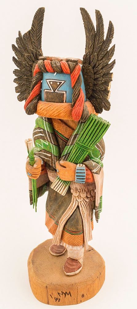 Crow Mother kachina, signed by M.M. 11" x 4" x 2.5". Four of the crow feathers are broken off--see photo. Otherwise, very good condition. Date: 1991 Location: Hopi, Arizona HWAC # 49319