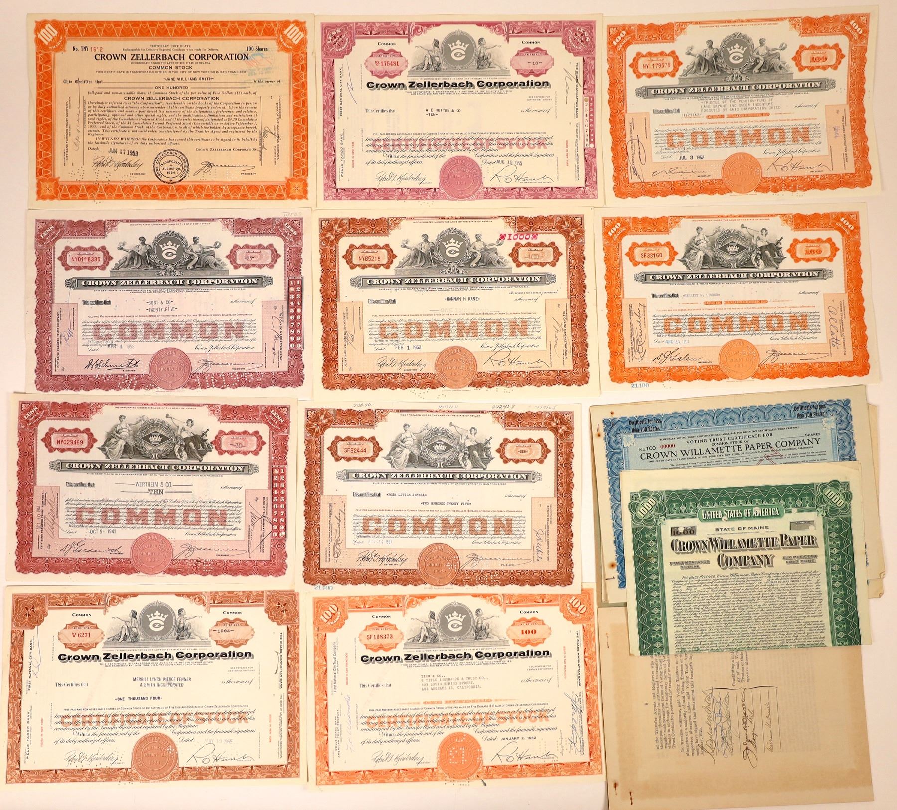 Collection of 17 includes 16 stock certificates and one bond, plus a trustee's folder, from the Crown Willamette Paper Company, inc. in Maine, and Crown Zellerbach Corporation, inc. in Nevada, from 1916-1965. Included are: one canceled unused Crown Willamette Paper Company bond dated May, 1916, 15" x 10", and an eight-page trustees' folder dated Jan. 1, 1926, with six trustees' signatures, containing six unused certificate specimens measuring 11.5" x 8" each, all in pristine condition; and 10 Crown Zellerbach Corp. certificates, each 12" x 8", with issue dates from 1941-1965, various colored ornate borders, with Greek-inspired vignettes, all canceled and signed by President and Secretary, with several more signatures on the backs. In excellent condition with light folds. See photo for more details.
