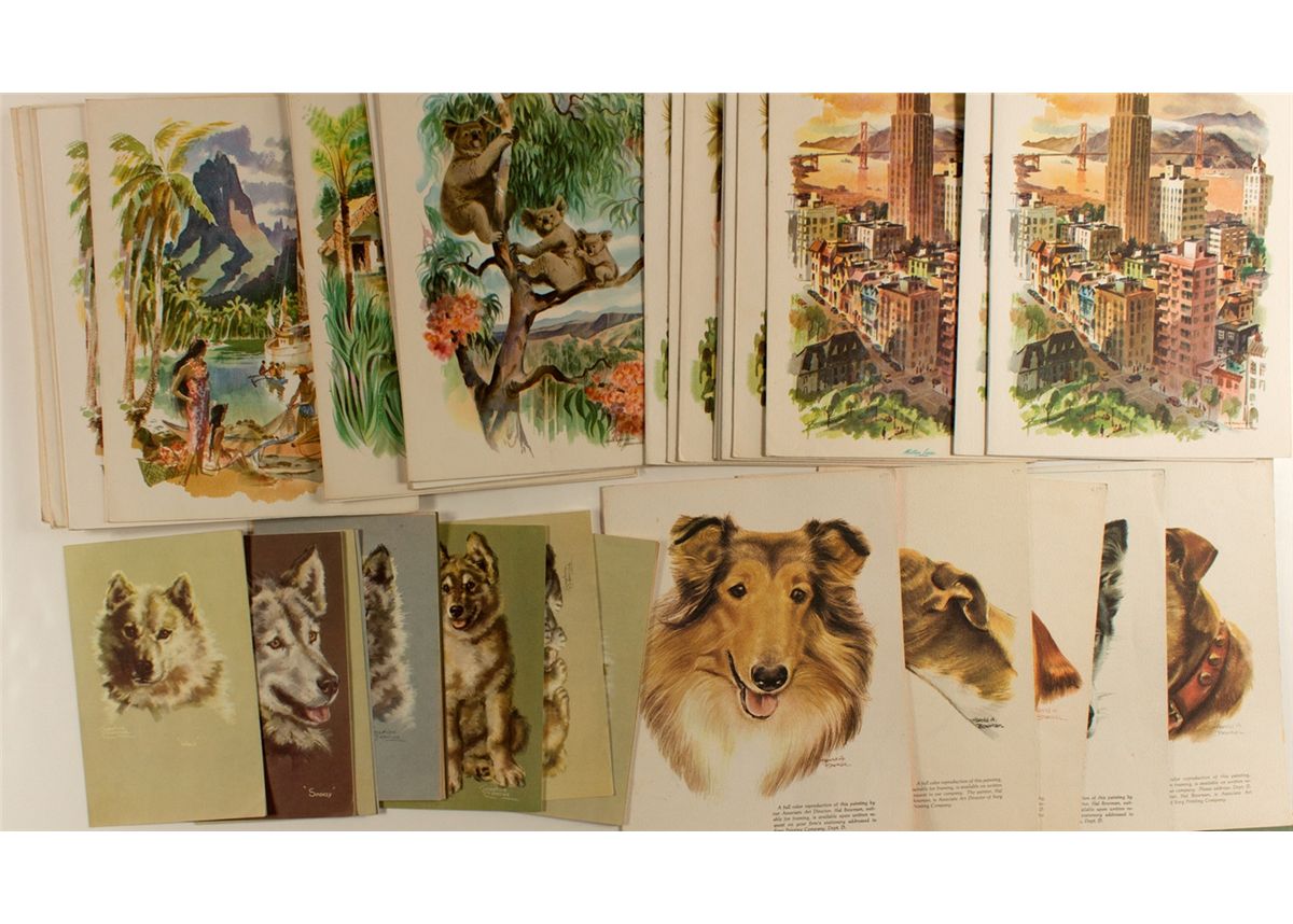 From the collection of Ken Prag. Twenty-five Matson Line keepsake menus from ships such as the Lurine, Maripose, Matsonia, etc. featuring stunning water color prints of exotic destinations such as Fiji, New Zealand, Samoa, San Francisco, etc., by Louis Macouillard. 17 Alaska Cruise Lines menus featuring illustrations of Alaskan army dogs painted Josephine Crumrine. Also 5 of "Sorg's Series of Man's Best Friend" by Harold Bowman.