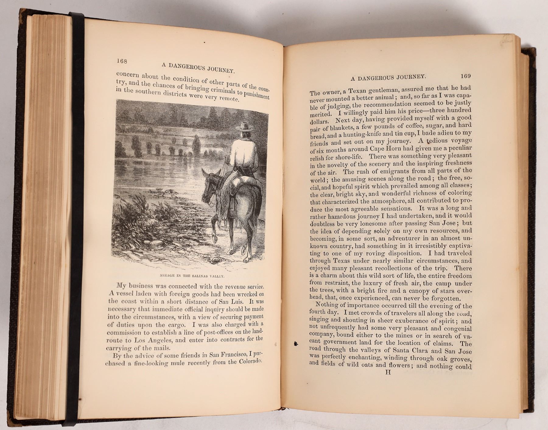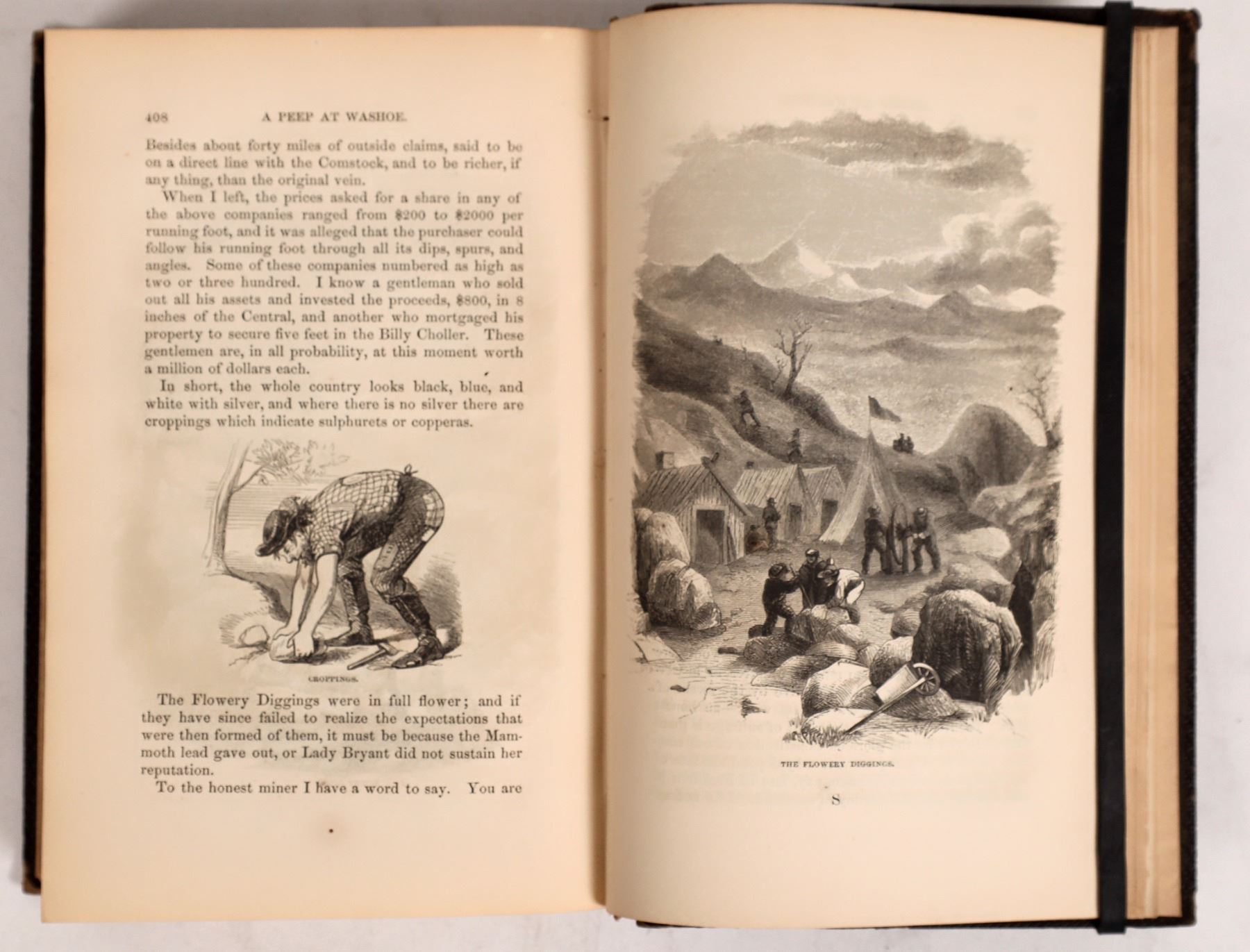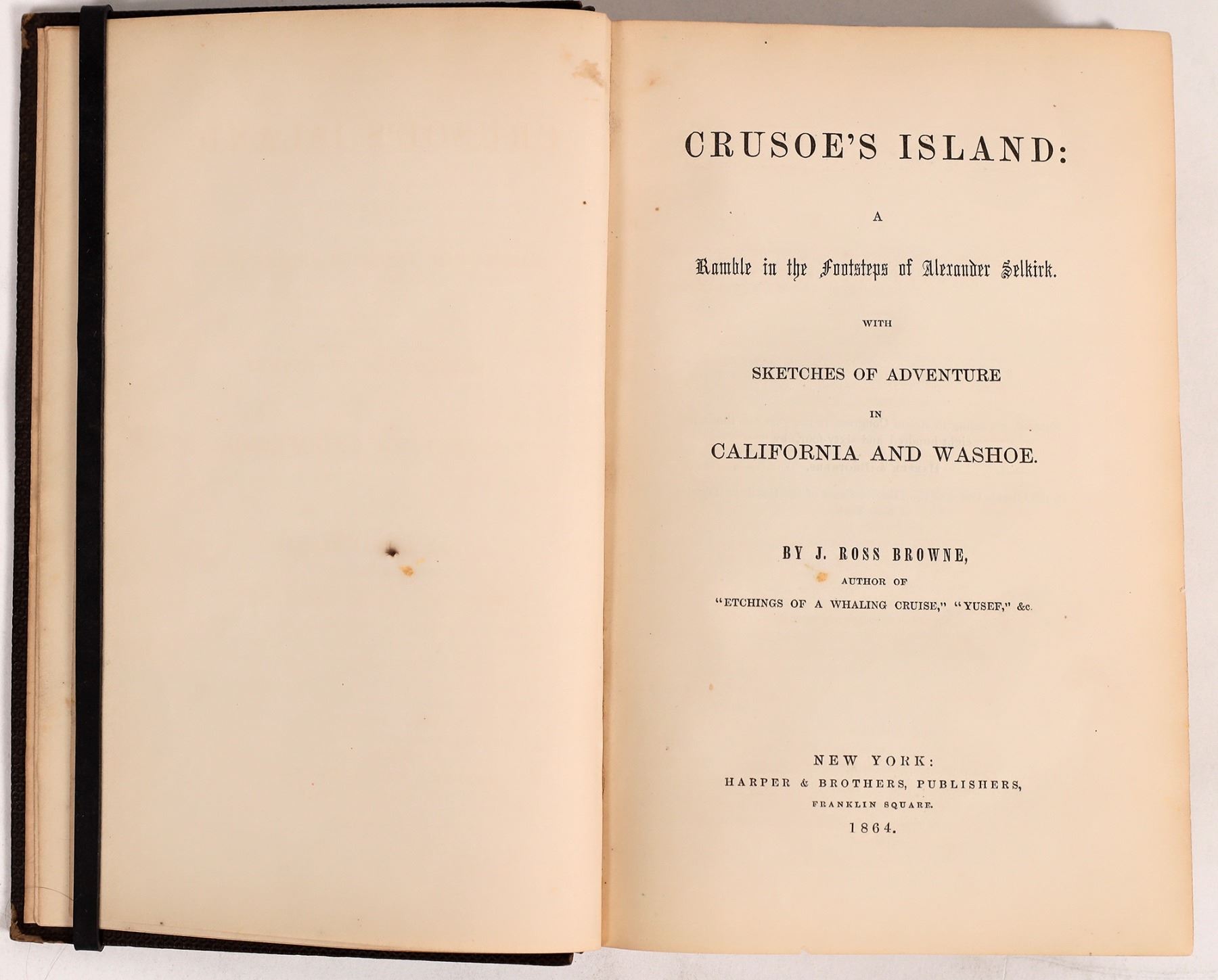 A Ramble in the Footsteps of Alexander Selkirk with Sketched and Adventure in California and Washoe by J. Ross Browne 1864. 436pp. Many woodcuts. Dark brown buckram hardback. Tales of an American Crusoe, stranded on San Fernandez in the mid-1800s, with the author's adventures in California and the Washoe Mines in the early 1860's (p.309-436). J. Ross Brown revisited Washoe a few years later and wrote another short story on his findings. Both appeared in Harper's Magazine. It is said that Mark Twain adopted much of J. Ross Browne's writing style and humor a decade later. The engravings of colorful characters and California scenes are outstanding as the author was quite an artist in his travels which found favor in Harper's Magazine. Spine is starting but does not affect title or author. HOWES B876. COWAN, p.78.