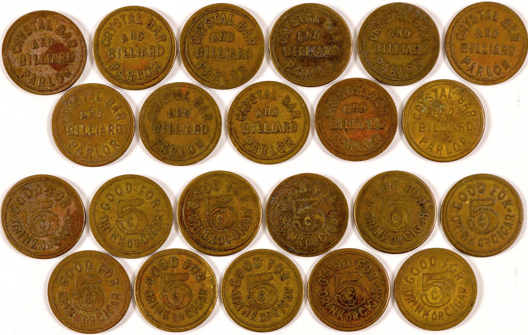 Lot of eleven: Obv.: Crystal Bar / And / Billiard / Parlor; Rev.: Good For / 5c / Drink or Cigar. Br., rd., 24 mm.