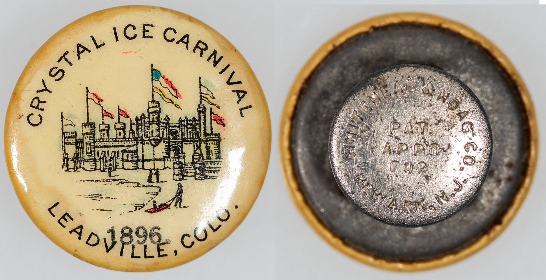 Made by Whitehead and Hoag of Newark, New Jersey, a choice pictorial souvenir coat stud of the 1896 Crystal Ice Carnival of Leadville Colorado. 22 mm. The Ice Palace was built in just 36 days utilizing 5,000 tons of ice. The palace held a skating rink, a restaurant, a ballroom, a dance floor, gaming rooms, and a carousel house. Leadville Colorado 1896