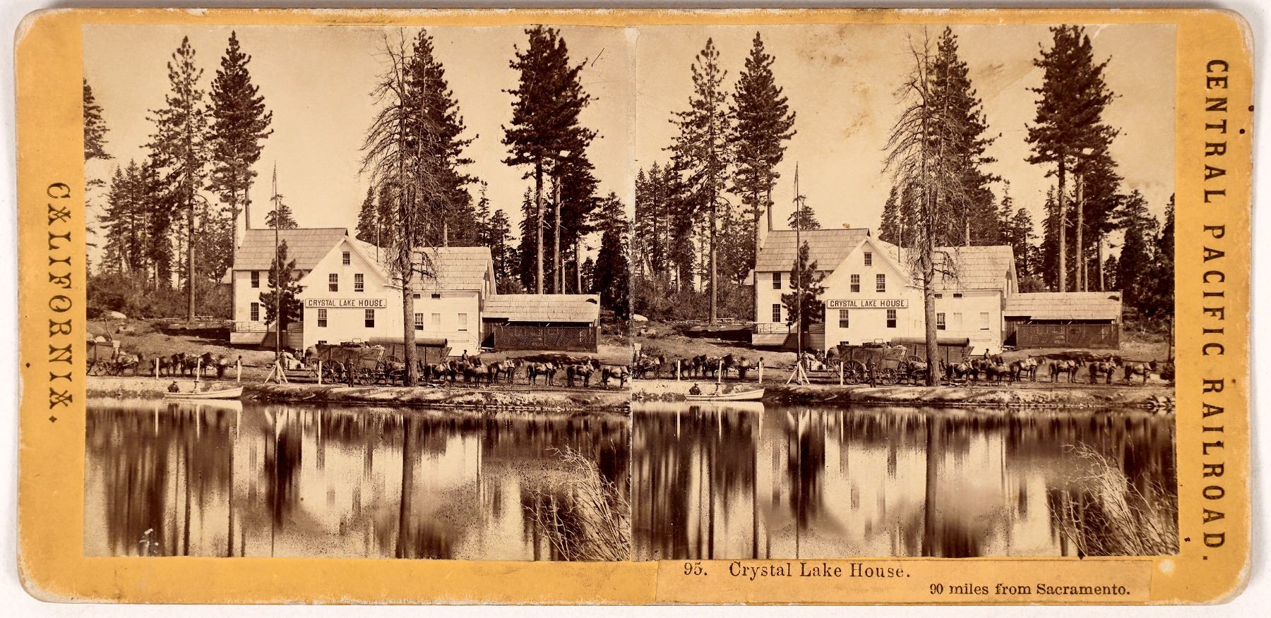 Rare. View shows wagon trains in front of lakefront hotel with sign. "No. 95. Crystal Lake House. 90 miles from Sacramento." Central Pacific Railroad California series. Photographed and published by Frank Durgan, No. 65 J. Street, Sacramento. For Sale by ES Denison, No. 3 Front St., Sacramento. The Crystal Lake House was located near Cisco on the Central Pacific Railroad, Placer County, California. In 1867, the resort was advertised as being owned by ES Fogg. In June 1887, it was reported that the Crystal Lake House, on the Dutch Flat and Donner Lake Wagon Road at Cisco, had burned to the ground.