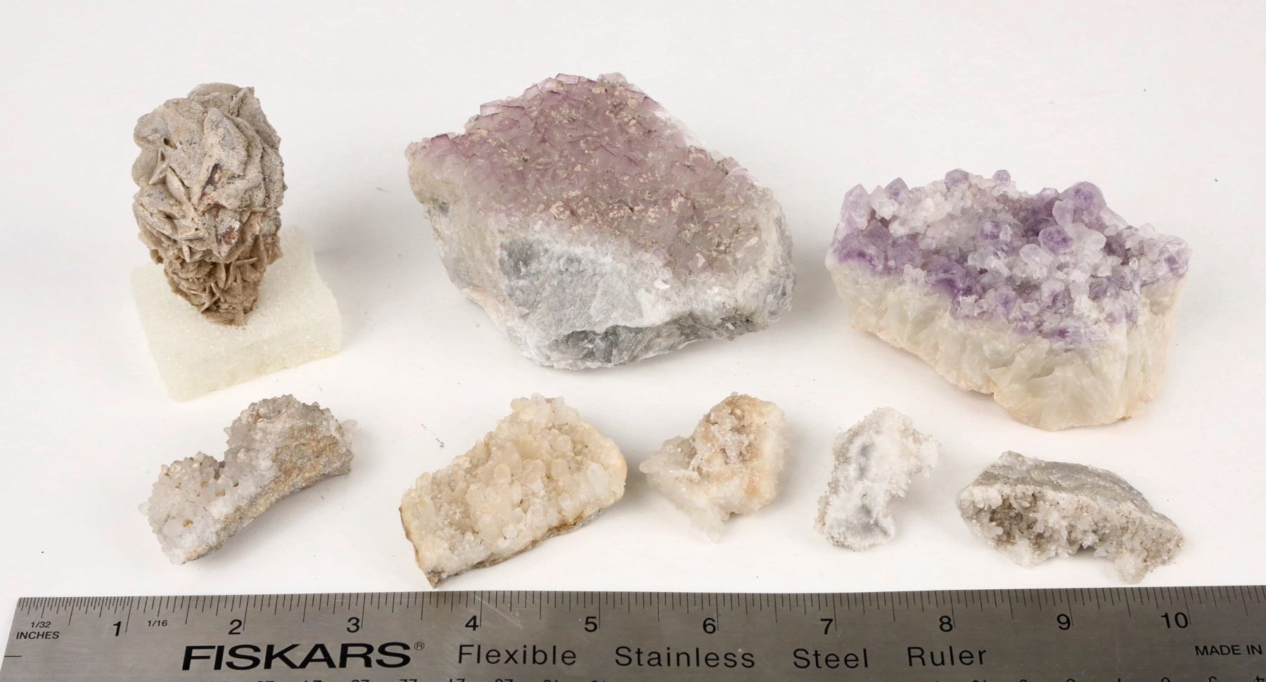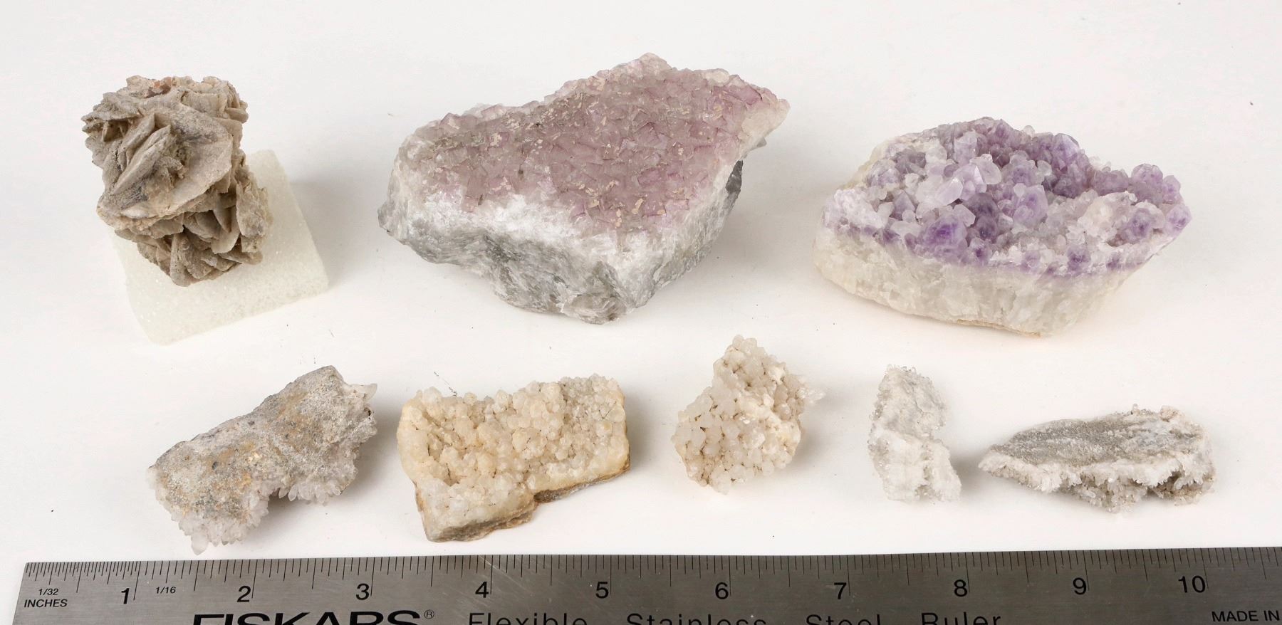 Purple Fluorite from Kentucky, Amethyst from Humboldt County, Selenite from Mexico, and quartz crystals from Colorado.