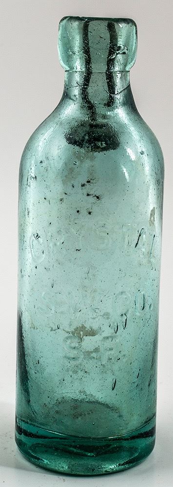 Crystal ( Au) / S.W. Co. / S. F. // Thick, square collar, applied top ! Hutchinson style. 1886-1888. Pale aqua, and in nice condition. Need a little light cleaning inside, to be perfect. Good quality glass. HWAC# 30108 Date: Location: San Francisco, California