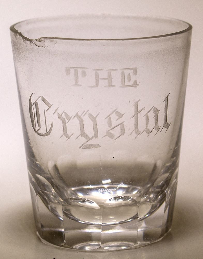 Extremely rare shot glass from the Crystal Saloon in Virginia City, c.1870s-80s. The shot glass, possibly the only one known, was dug by Holabird behind the Miners Union Hall. It was an exciting discovery at the time, and it is unknown if others exist. This is a choice Virginia City collectible from the heyday of the whiskey days in the 1800s. Please inspect. X-Holabird. City: Virginia City State: Nevada Inventory Number: 39517