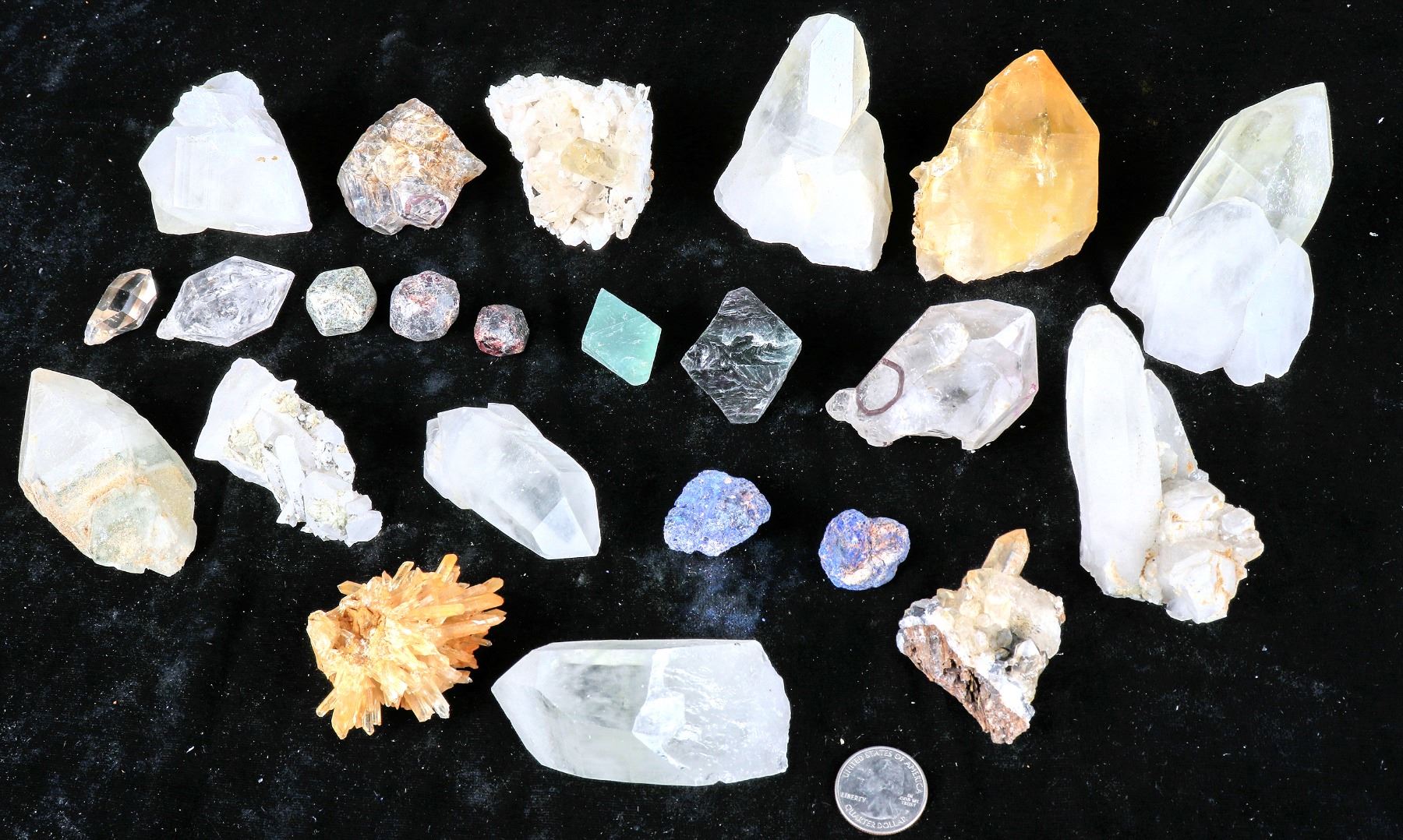 Mostly large single quartz, also includes garnet, fluorite, bubble quartz, azurite. 1/2" to 3" China Chunlin Zhu Collection
